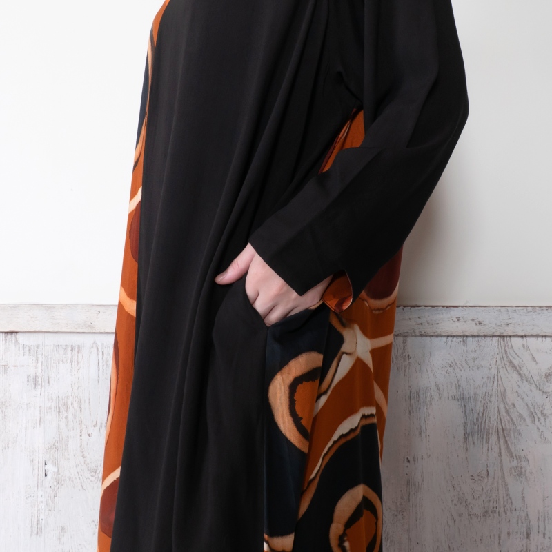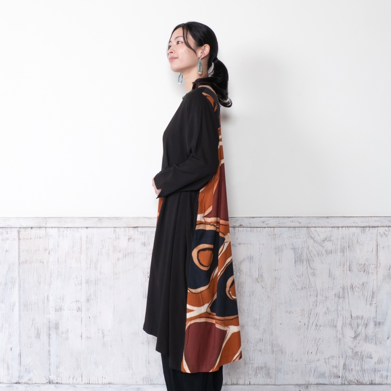 柄と無地のコントラストが効いたワンピース。すっきりとした縦ラインで上品な印象。袖口の内側には柄があしらわれており、折り返すと柄が表に出るデザイン。一点一点異なる筆致や色の重なりで、手仕事ならではの味わいが感じられる。滑らかな落ち感のある生地を使用し、シルエットがすっきり見えするアイテム。シンプルな無地のボトムスを合わせた着こなしがおすすめ。