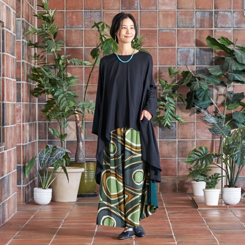 | 仕様 | サイドフレアデザイン ウエストゴム入りギャザー(ヒモ付き) サイドポケット付き |