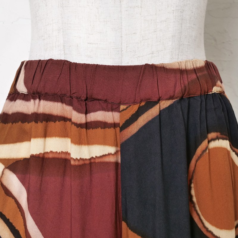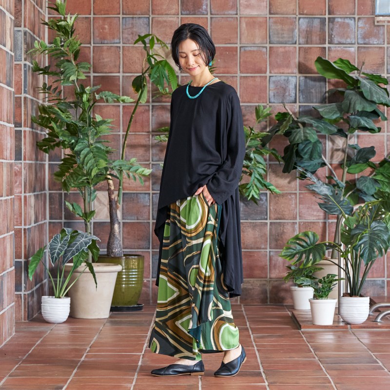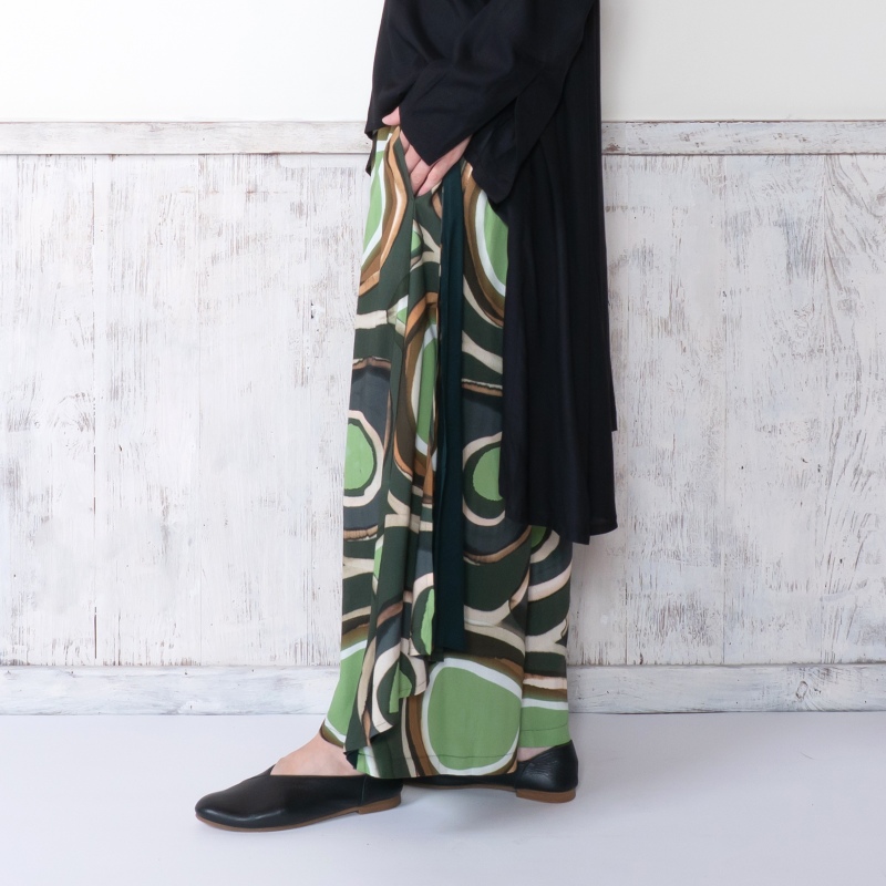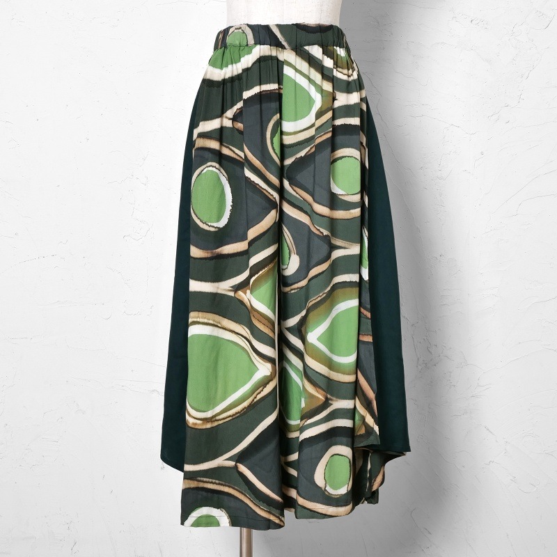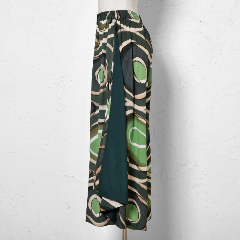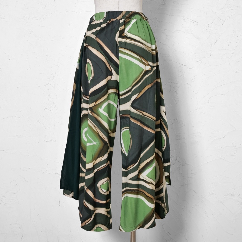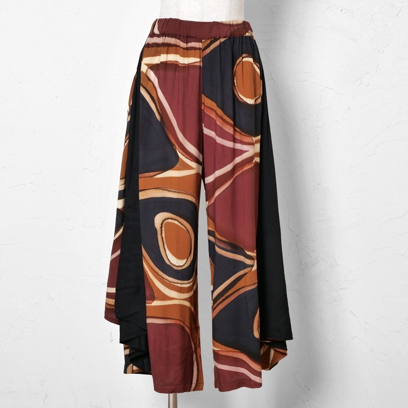 柄と無地のコントラストが効いたワイドパンツ。サイドにあしらったドレープのパーツが軽やかな動きを添えてくれる。一点一点異なる筆致や色の重なりで、手仕事ならではの味わいが感じられ、滑らかな落ち感のある生地を使用し、シルエットがすっきり見えするアイテム。シンプルな無地のトップスを合わせた着こなしがおすすめ。
