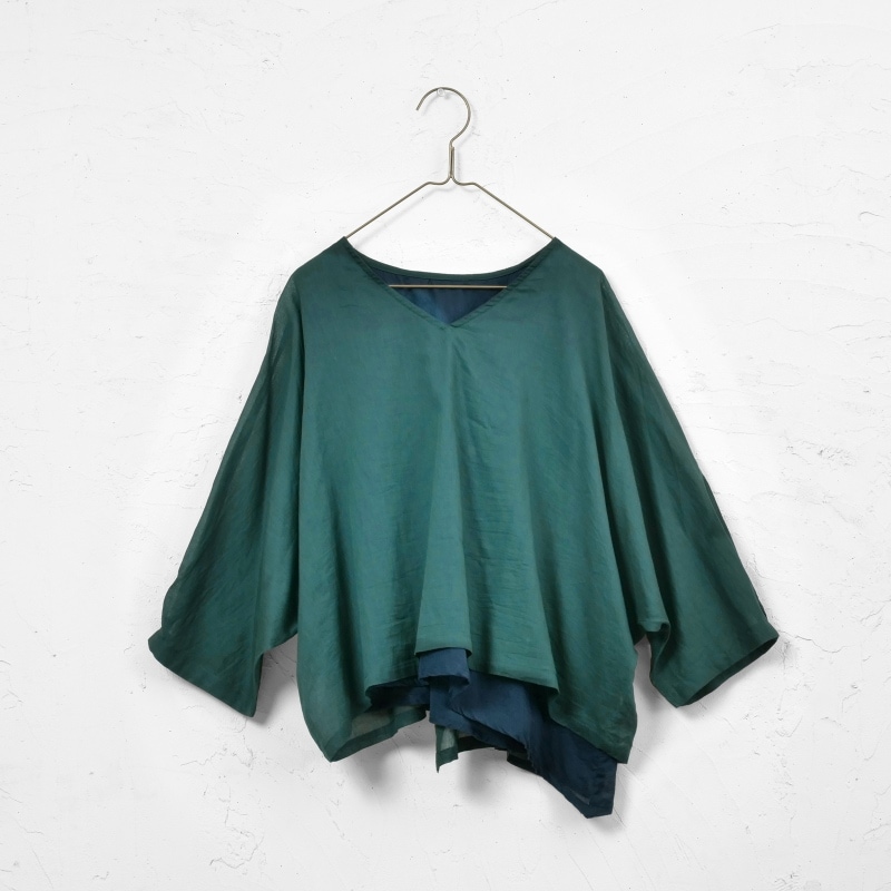 バイカラーのレイヤードが特徴のプルオーバー。薄手の軽やかなコットン生地を2枚組み合わせたシンプルなデザイン。柔らかいコットン素材の肌心地の良さもポイント。アシンメトリーにカットしたデザインが印象的。どんなアイテムにも合わせやすいシンプルな着回しアイテムです。