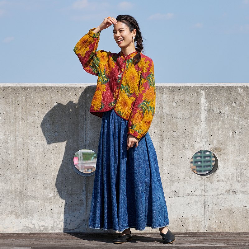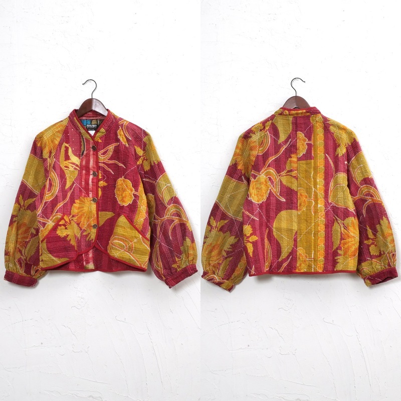 はじめはオンライン商品とばかり勘違いしていて、よく読んだら店舗にも!とのこと。グドゥリーは実際に手に取ってみないとわからないため電話確認して近隣店舗に行きました。2点心に留まるものがあり、決めきれず一旦は帰宅。翌朝再度来訪してファーストインスピレーションの赤系と金糸がポイントの黄系の2色の物に決定。やはり店舗でも、見るのと着てみるのでもまた印象が違いましたが穏やかな色の繊細な手仕事のジャケットに大満足です。