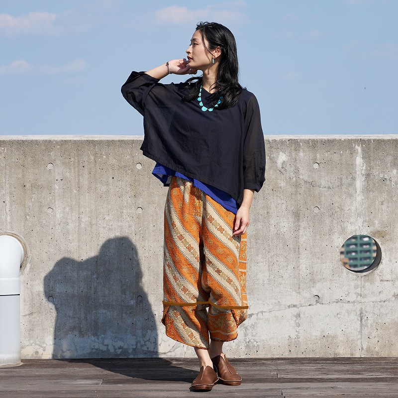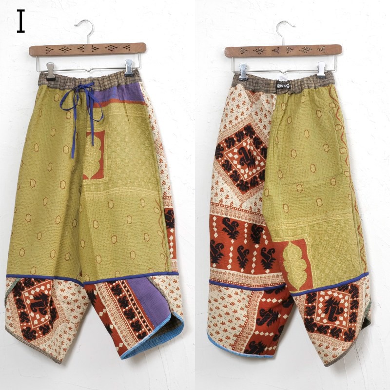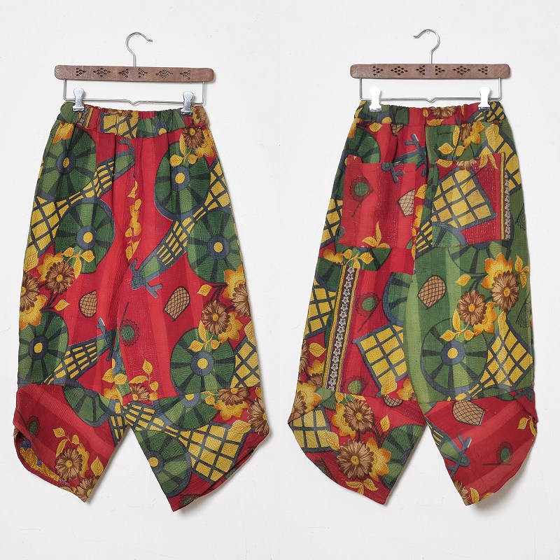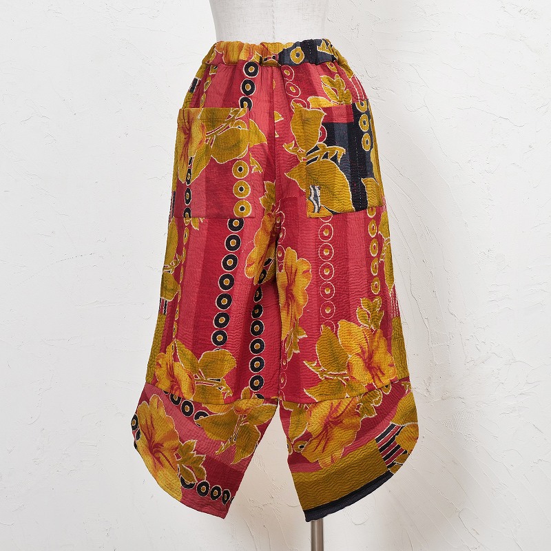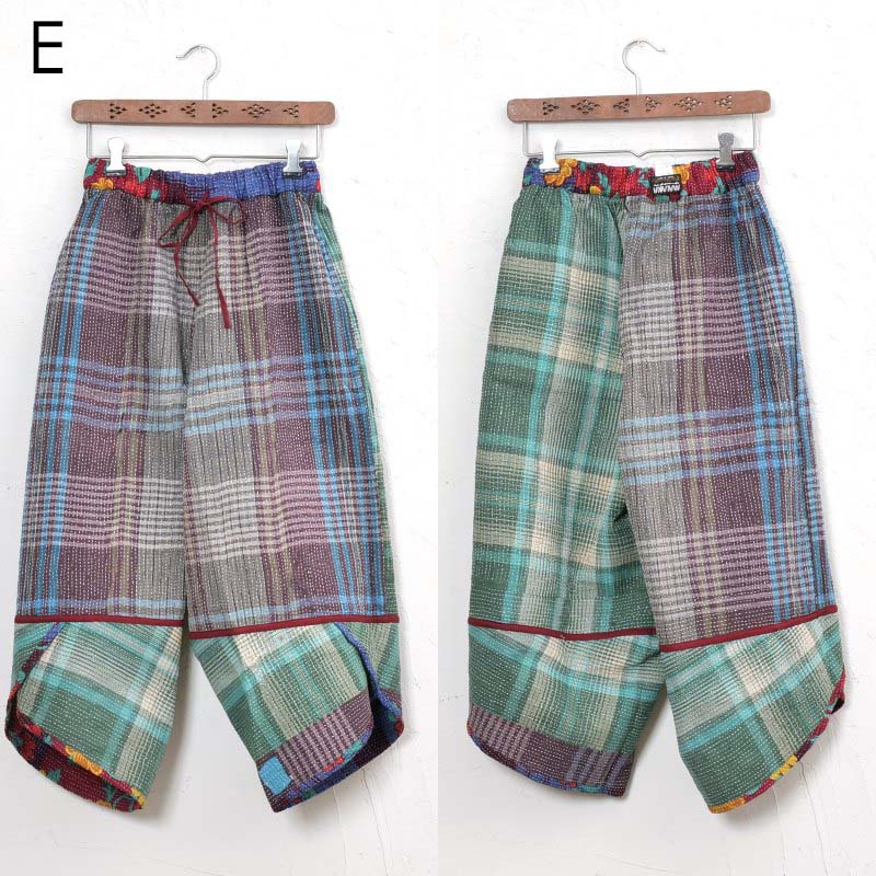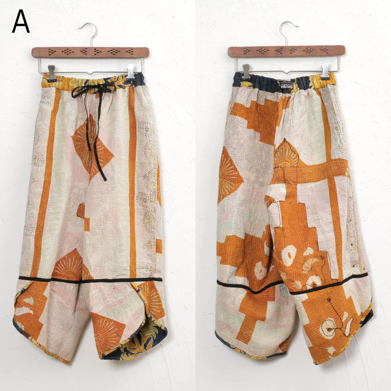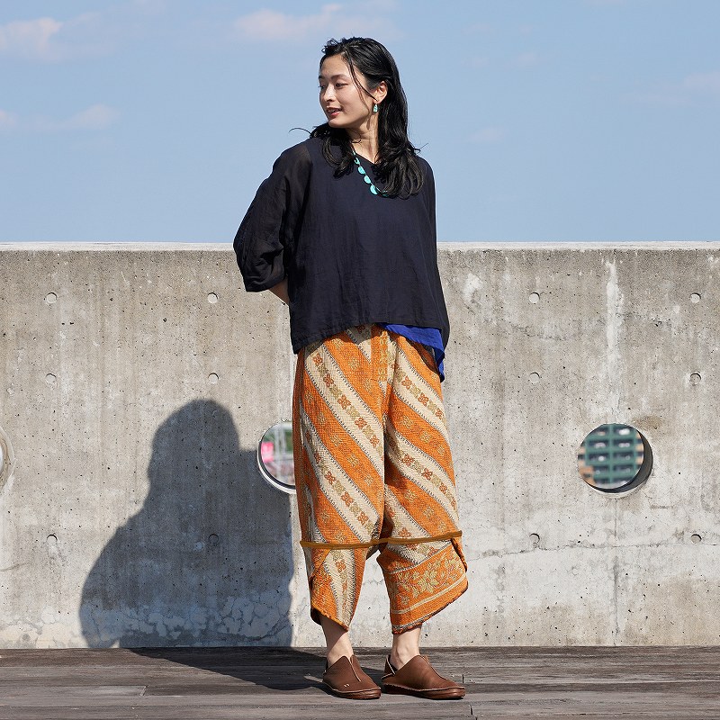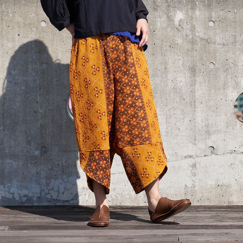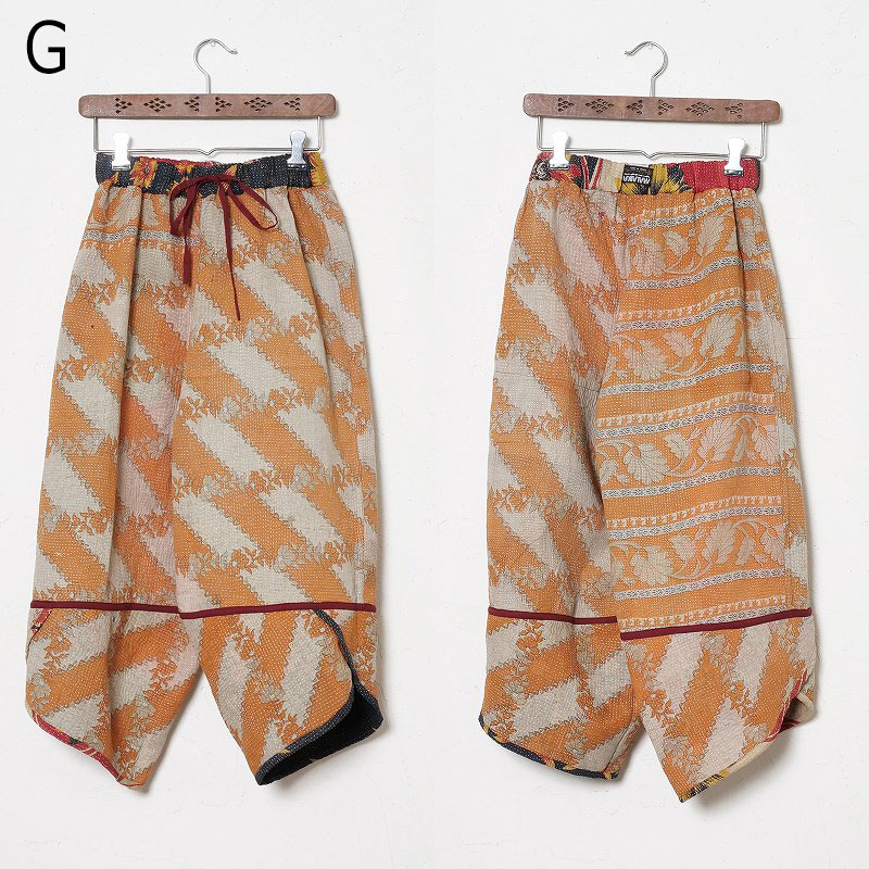 長く愛されるインドのグドゥリー生地で仕立てたリバーシブルパンツ。生地の組み合わせはすべて異なる1点もので、表裏で印象の異なるリバーシブル仕様なのもポイントです。ゆったりしたシルエットでカジュアルなテイストに仕上げ、裾のスリットがアクセントになったデザインです。シンプルなトップスを合わせた着こなしがおすすめのアイテムです。