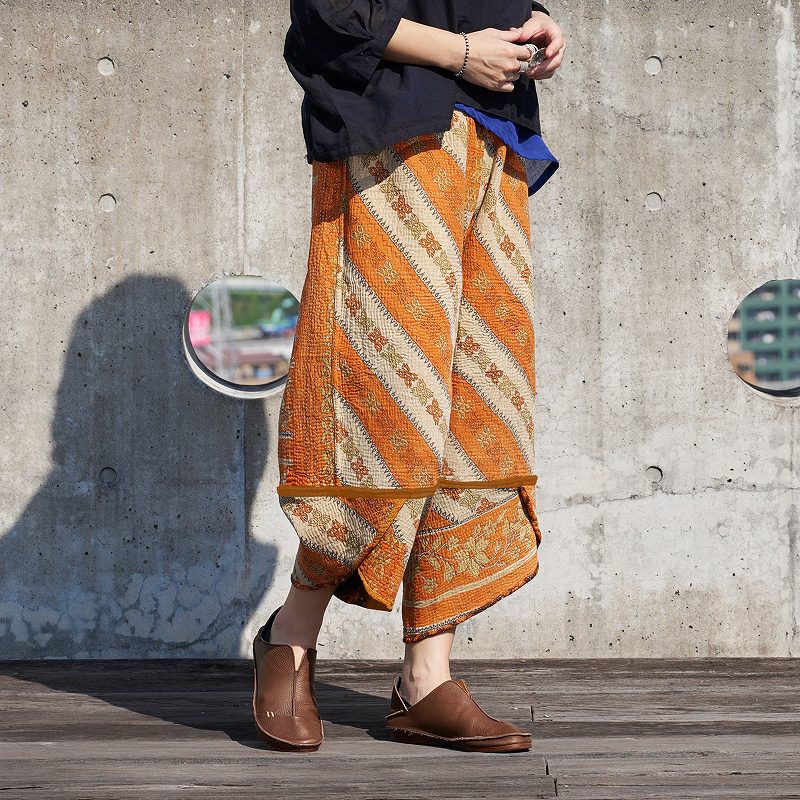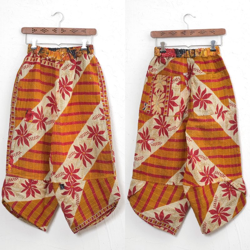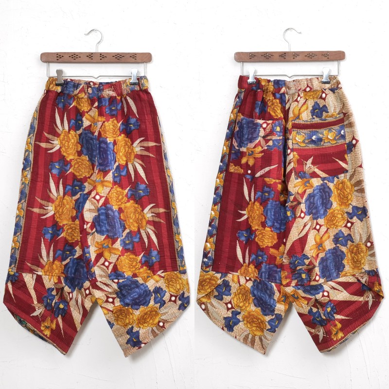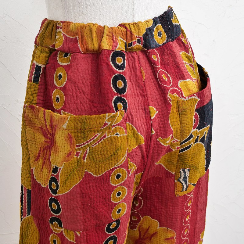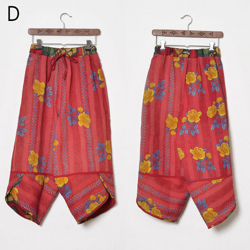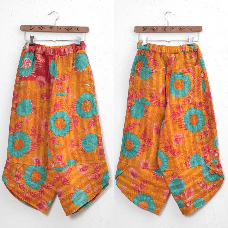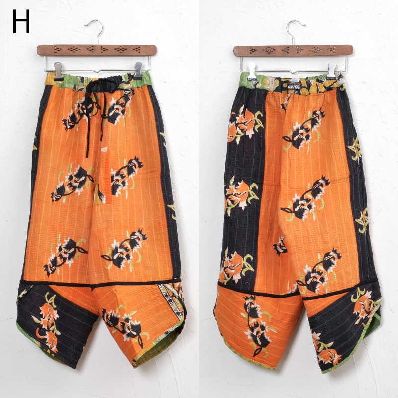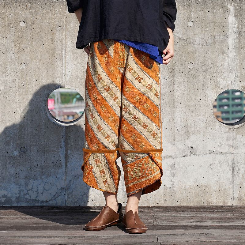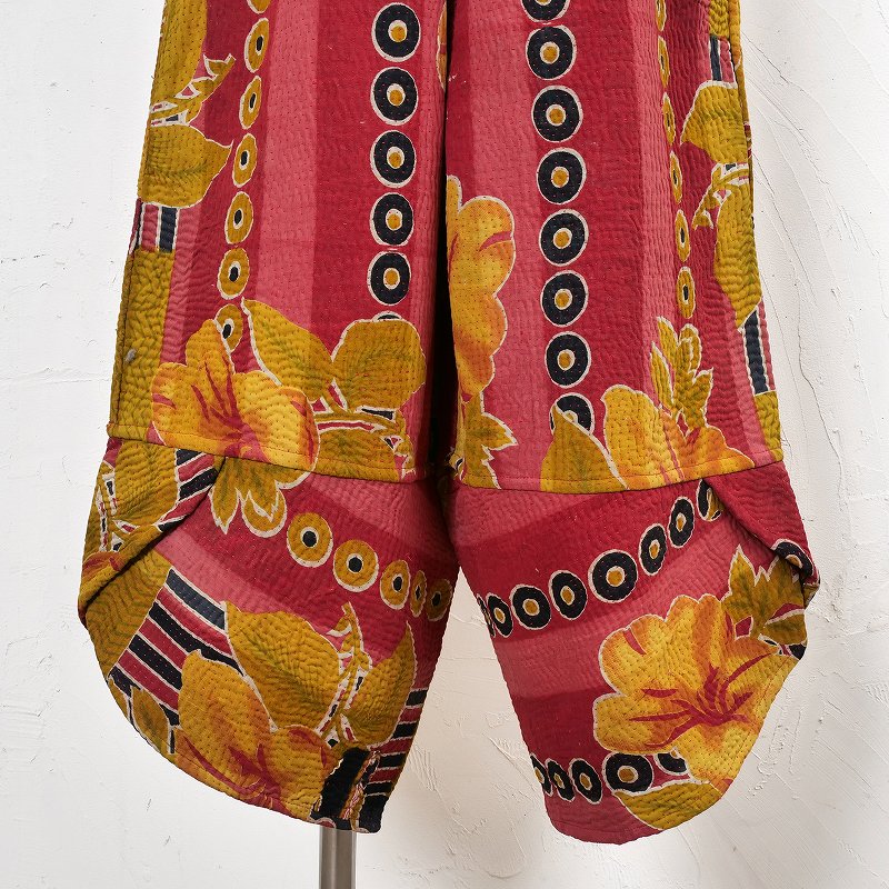 長く愛されるインドのグドゥリー生地で仕立てたリバーシブルパンツ。生地の組み合わせはすべて異なる1点もので、表裏で印象の異なるリバーシブル仕様なのもポイントです。ゆったりしたシルエットでカジュアルなテイストに仕上げ、裾のスリットがアクセントになったデザインです。シンプルなトップスを合わせた着こなしがおすすめのアイテムです。