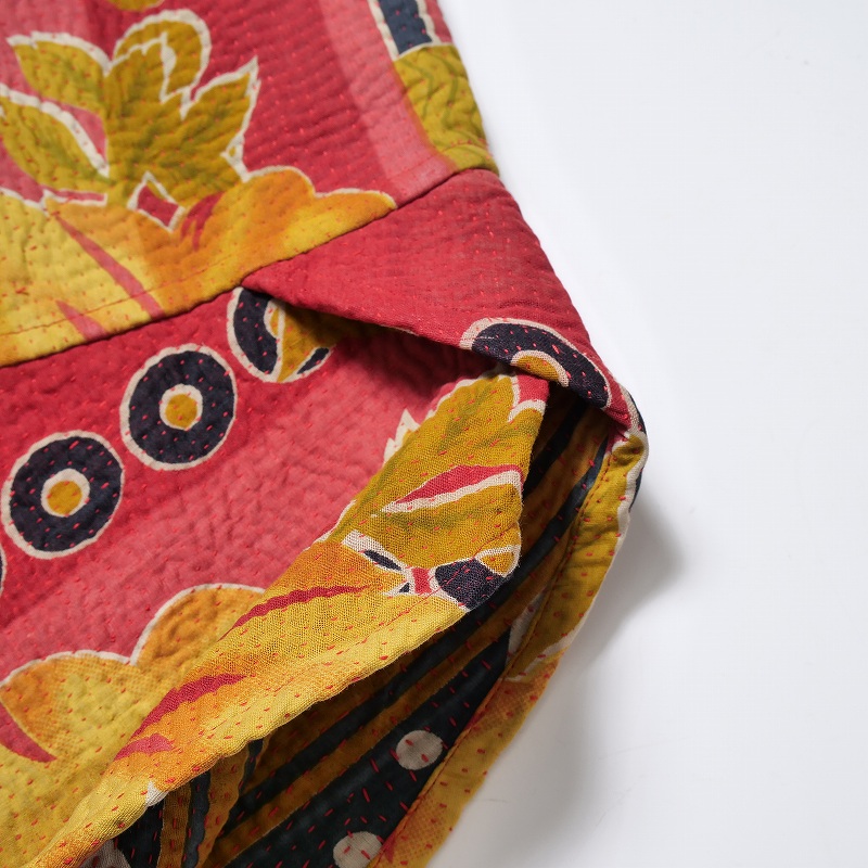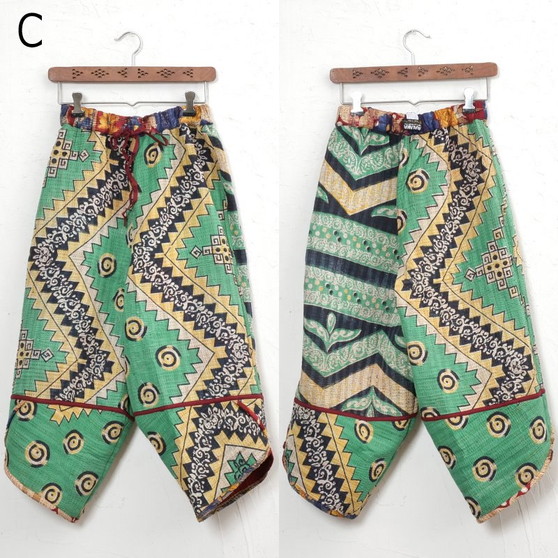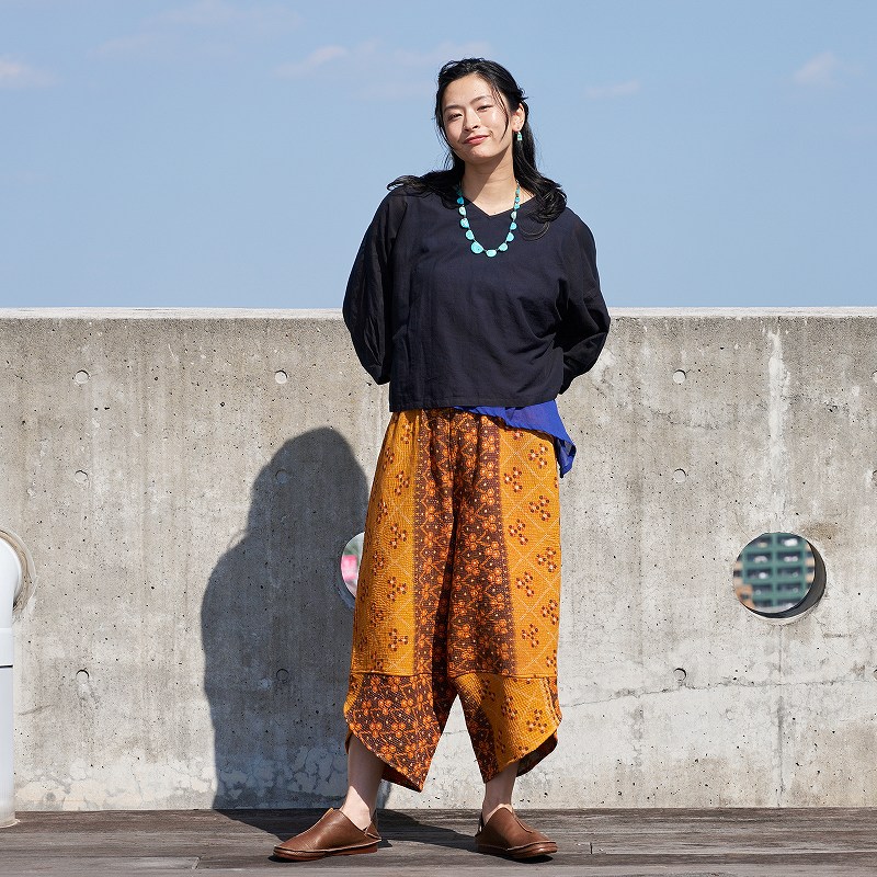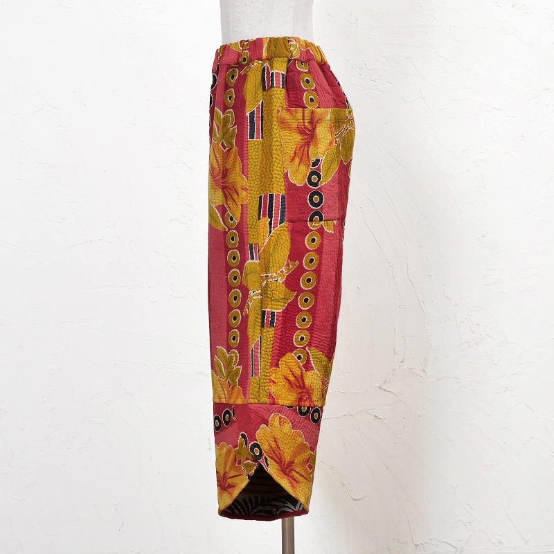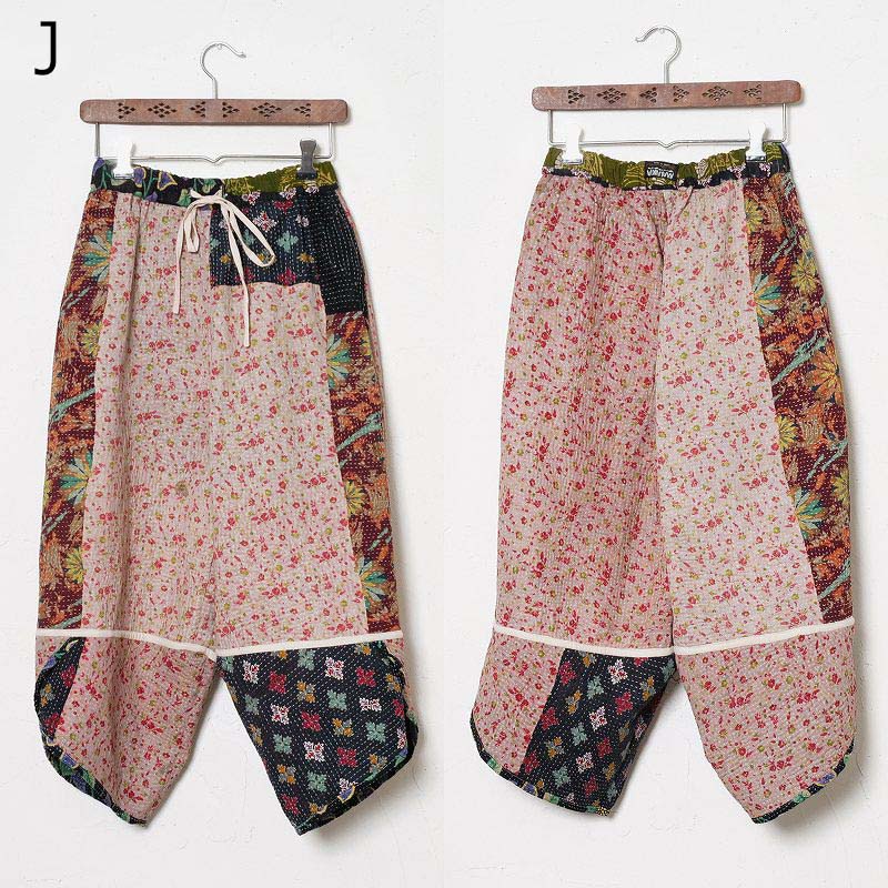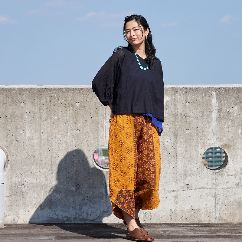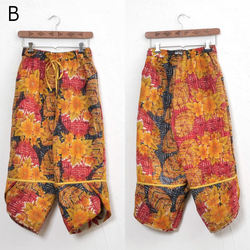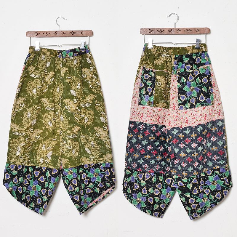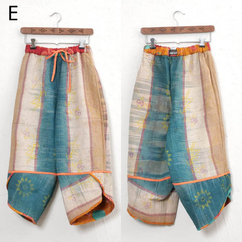 長く愛されるインドのグドゥリー生地で仕立てたリバーシブルパンツ。生地の組み合わせはすべて異なる1点もので、表裏で印象の異なるリバーシブル仕様なのもポイントです。ゆったりしたシルエットでカジュアルなテイストに仕上げ、裾のスリットがアクセントになったデザインです。シンプルなトップスを合わせた着こなしがおすすめのアイテムです。
