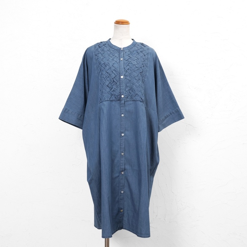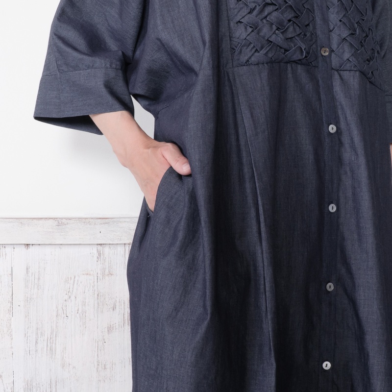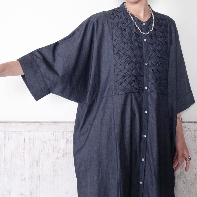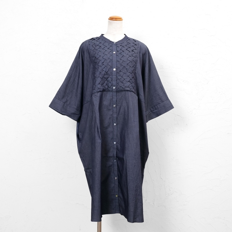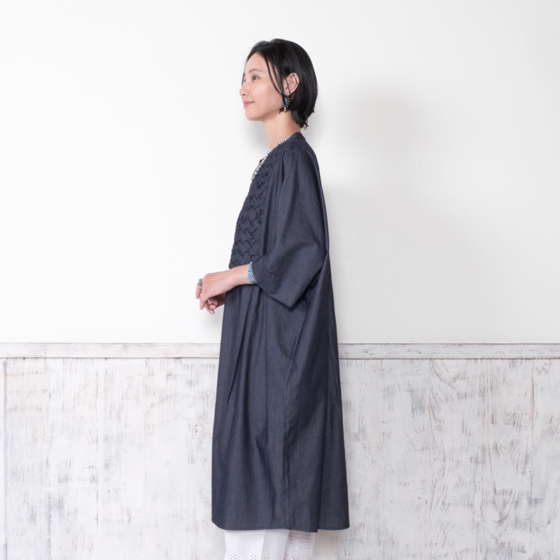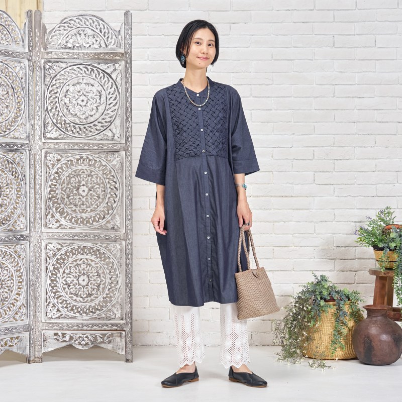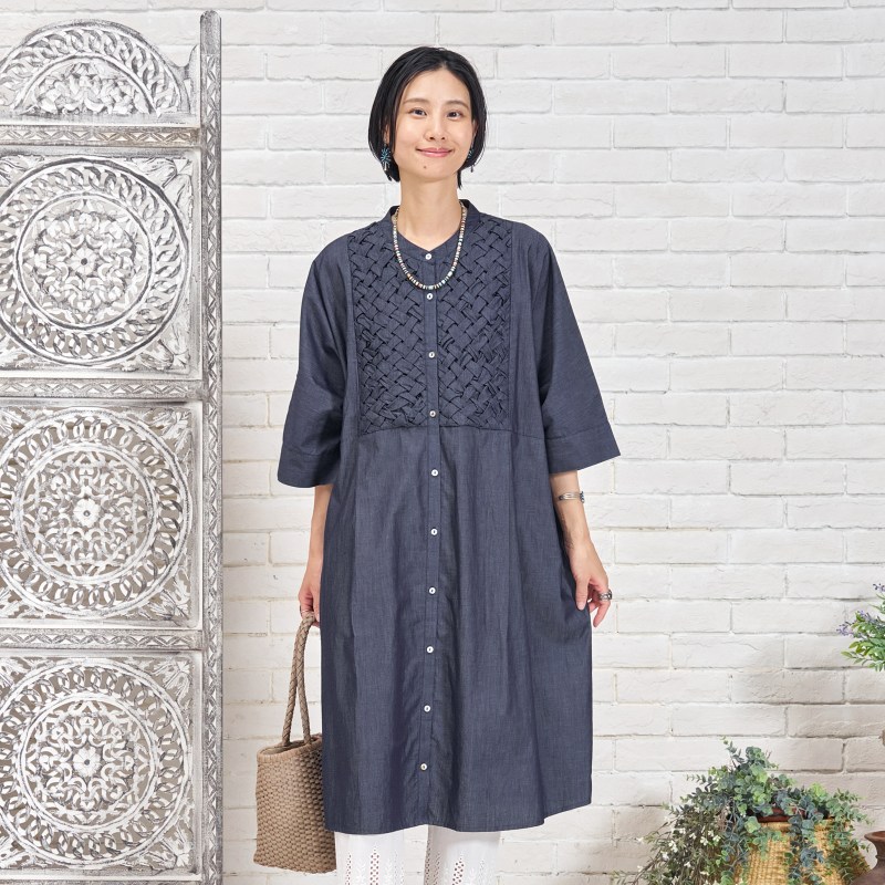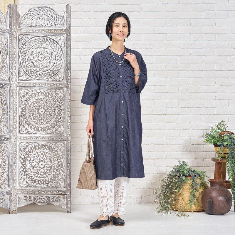 胸元に施されたスモッキングデザインが上品なアクセントになった前あきワンピース。濃紺と薄紺の2 色展開です。七分丈の袖が軽やかさをプラスし、着心地の良さも特徴です。写真はカットワークレースのペチパンツを合わせていますが、シンプルなボトムスを合わせたり、ボトムスなしで着こなすのもおすすめです。前あきにして羽織感覚で着こなすこともでき、個性的なデザインのわりに幅広い装いをお楽しみいただけます。