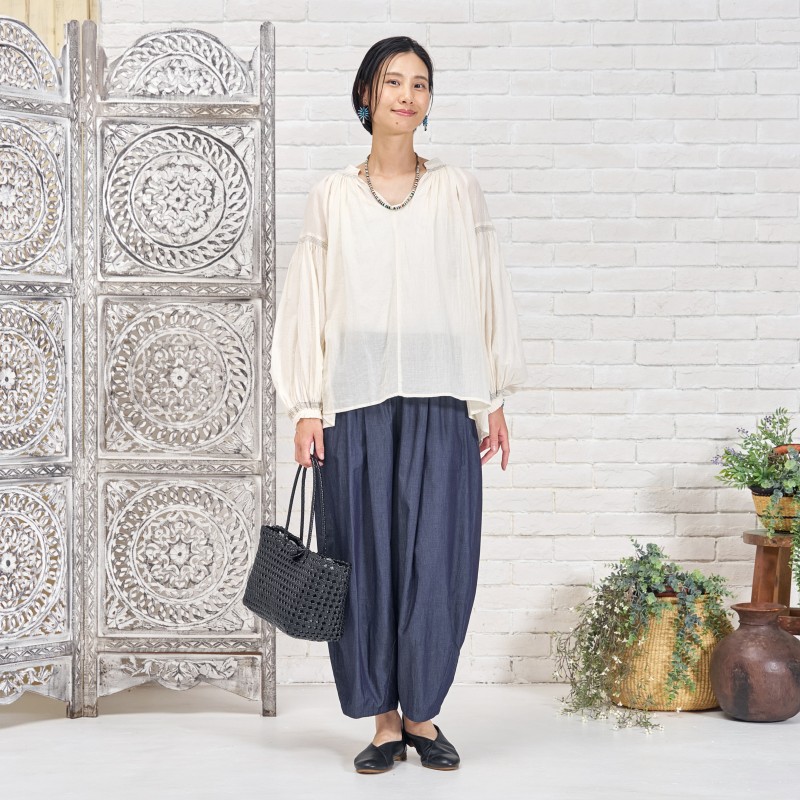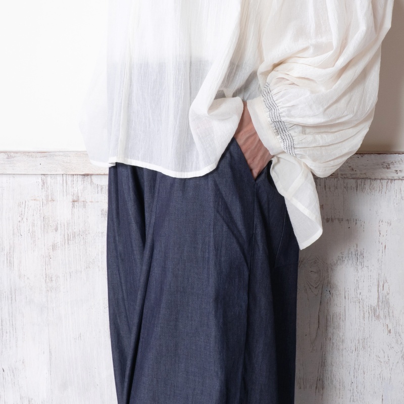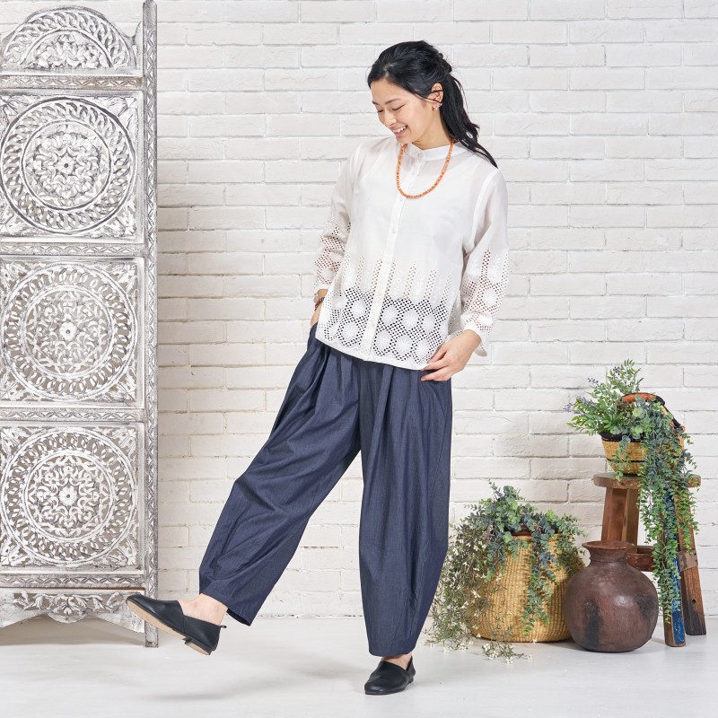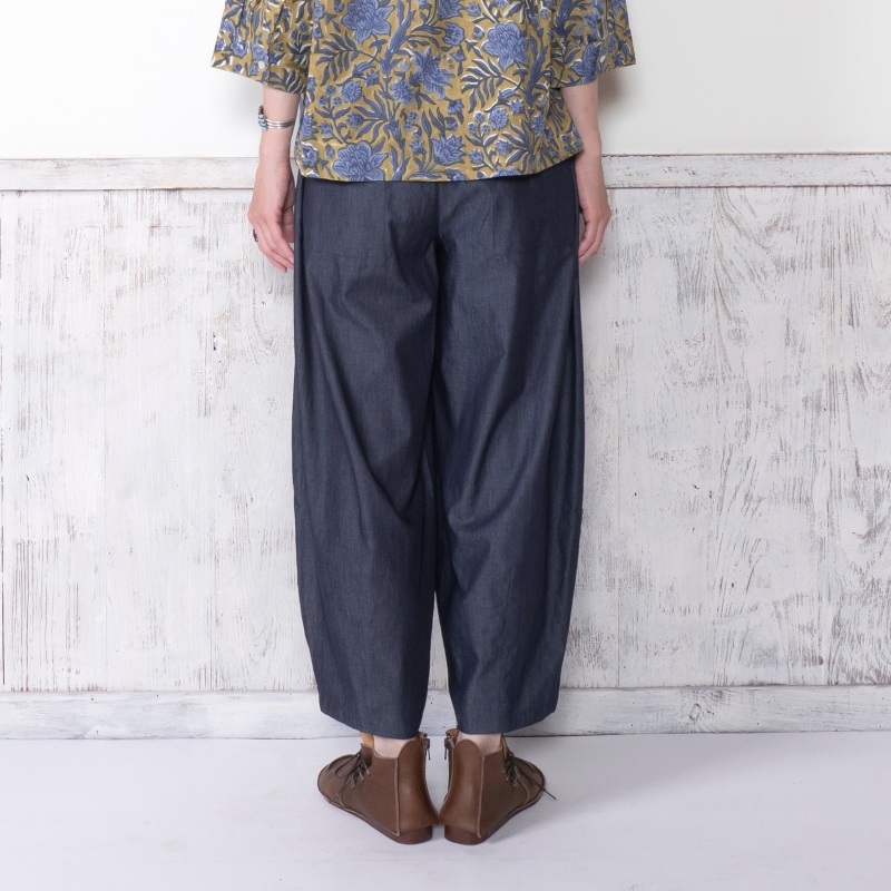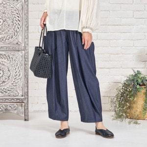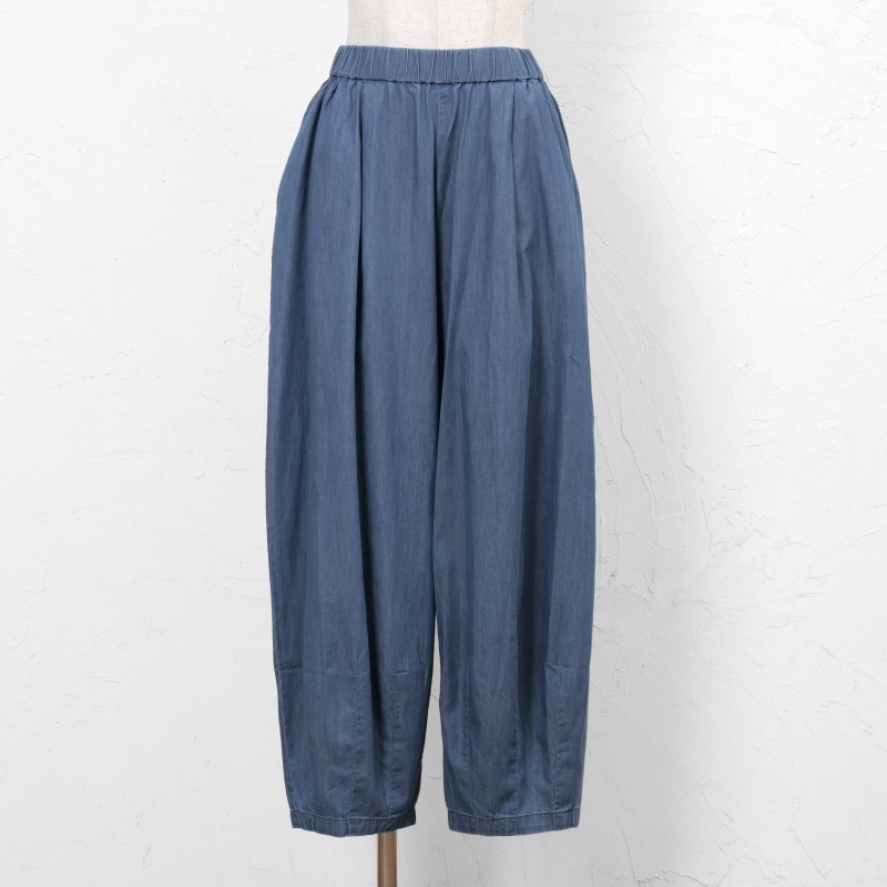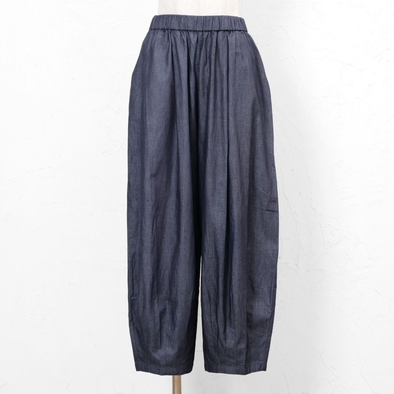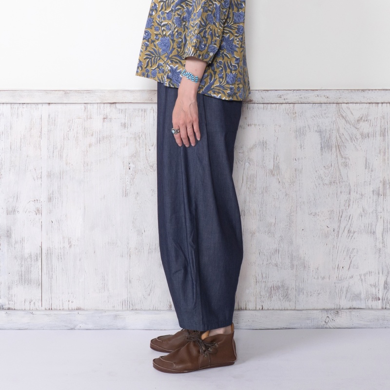 タックを入れてボリュームを出したコクーンパンツ。濃紺と薄紺の2 色展開です。程よいボリューム感でありながら、すっきりとした見た目も特徴です。シャンブレー生地ならではの上品さとカジュアルさのバランスが絶妙で、これからのシーズンに着回しの利く便利なアイテムです。大人ナチュラルな幅広い装いをお楽しみいただけます。