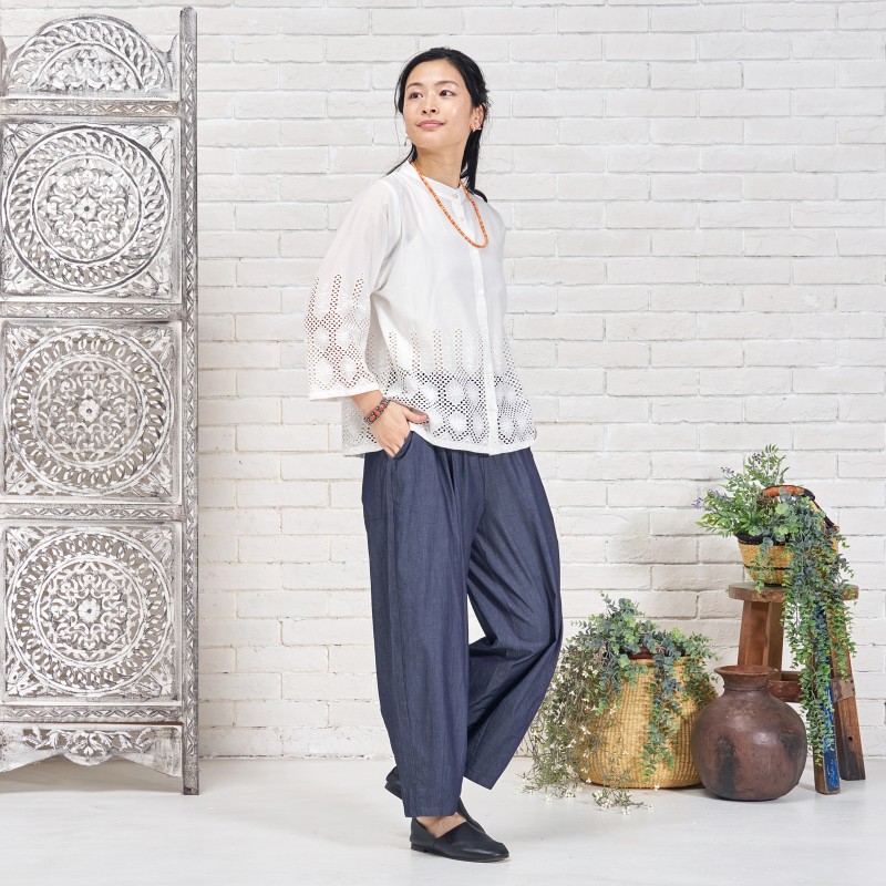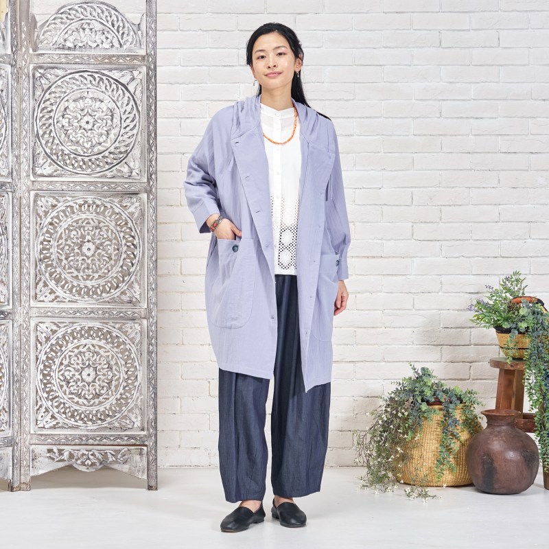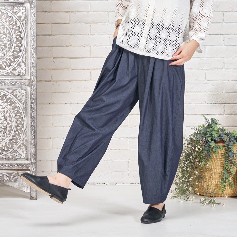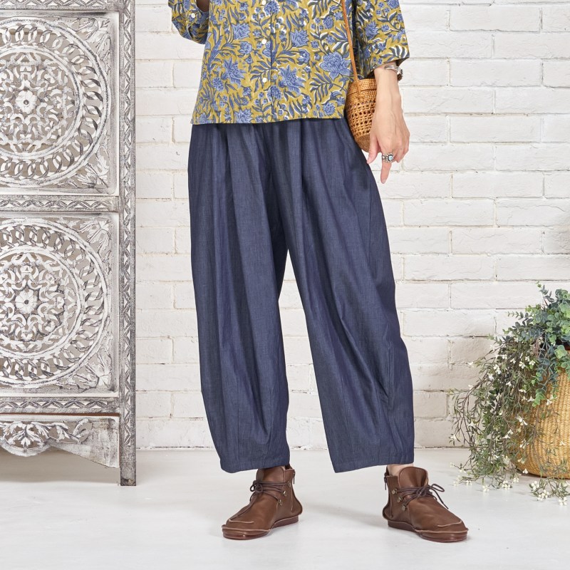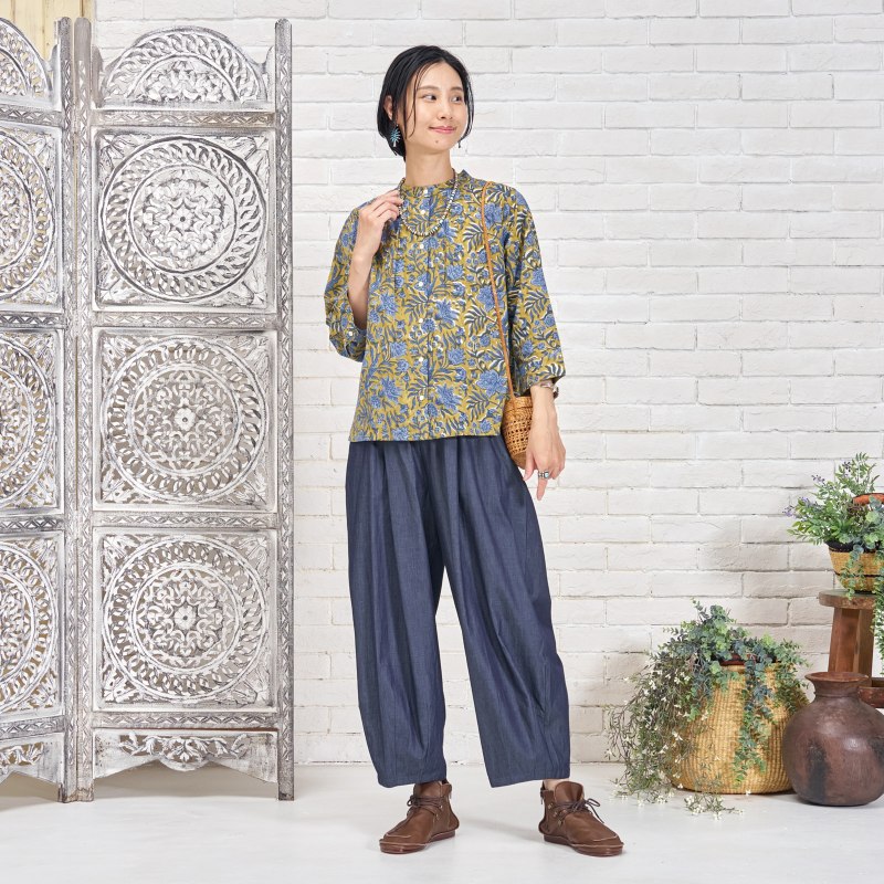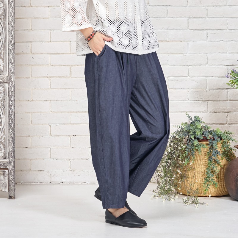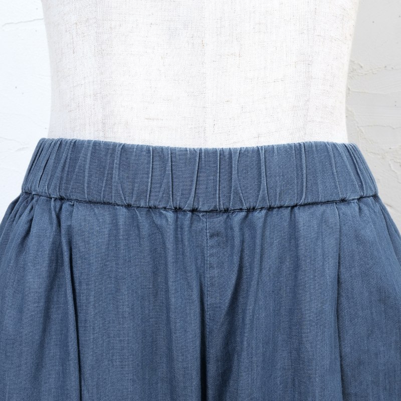 タックを入れてボリュームを出したコクーンパンツ。濃紺と薄紺の2 色展開です。程よいボリューム感でありながら、すっきりとした見た目も特徴です。シャンブレー生地ならではの上品さとカジュアルさのバランスが絶妙で、これからのシーズンに着回しの利く便利なアイテムです。大人ナチュラルな幅広い装いをお楽しみいただけます。