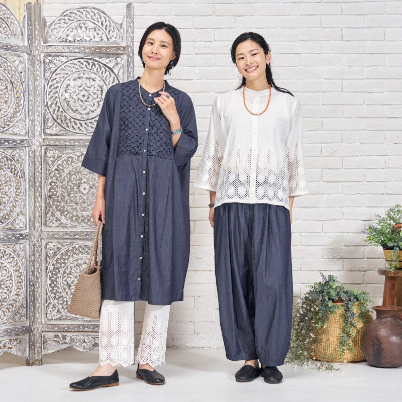 ヒンディー語で"村"という意味。都会の喧騒を離れて、自然のものと、自然に暮らす。そんな心地よい暮らしをテーマにしています。ナチュラルなで素朴な質感や着心地の良い素材。個性豊かで緩やかなシルエットが特徴のブランド。