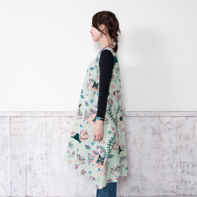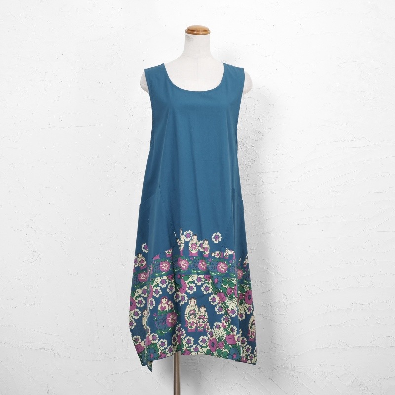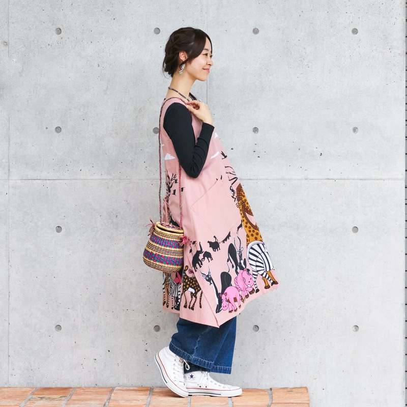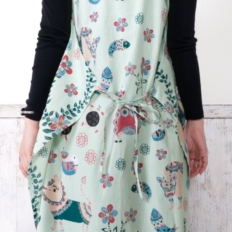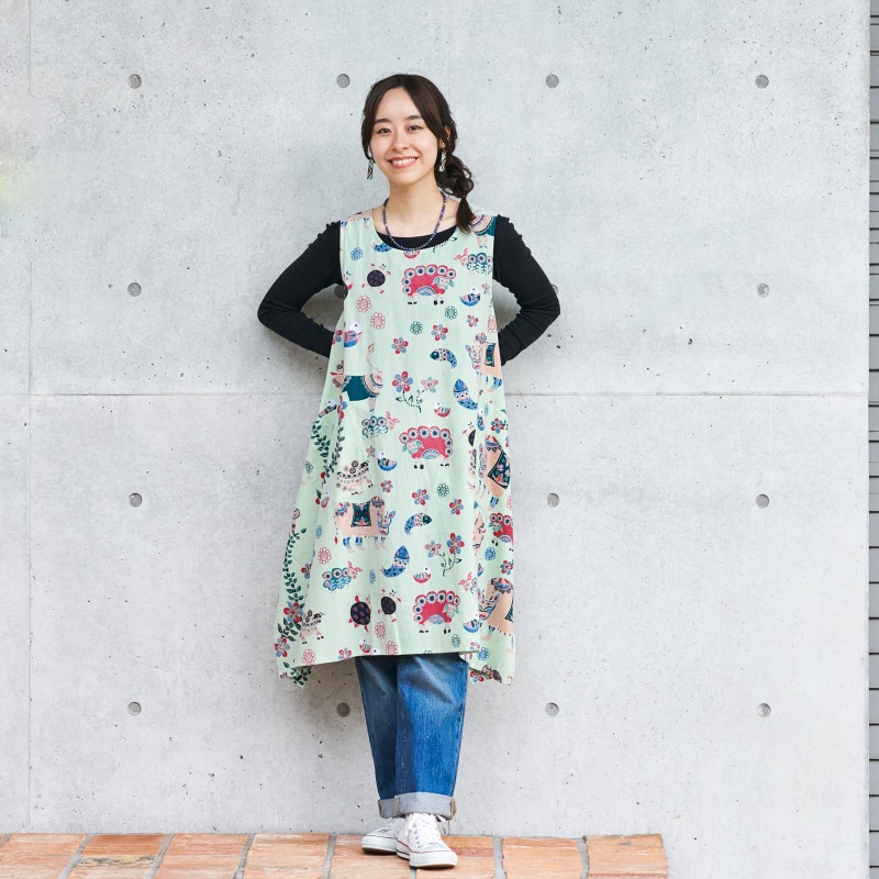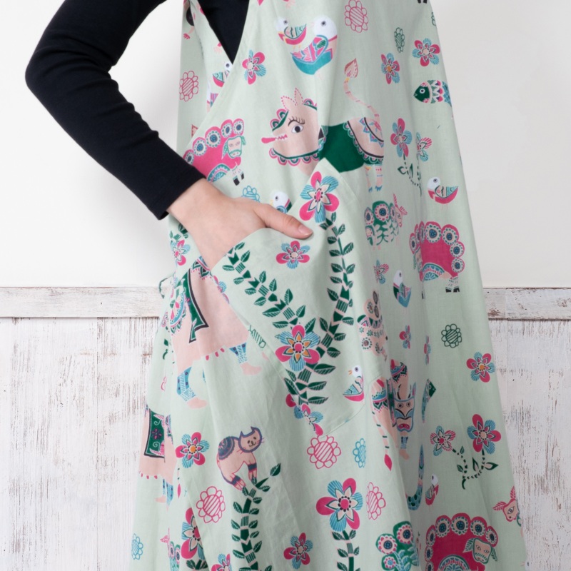ロングセラーアイテムのエプロンワンピース。淡く優しい色合いの物から、キャッチーな柄物までバリエーション豊かに取り揃えました。斜めに大きなポケットが付いてるので家事の際にちょっとしたものを入れておくのも便利です。