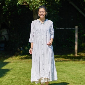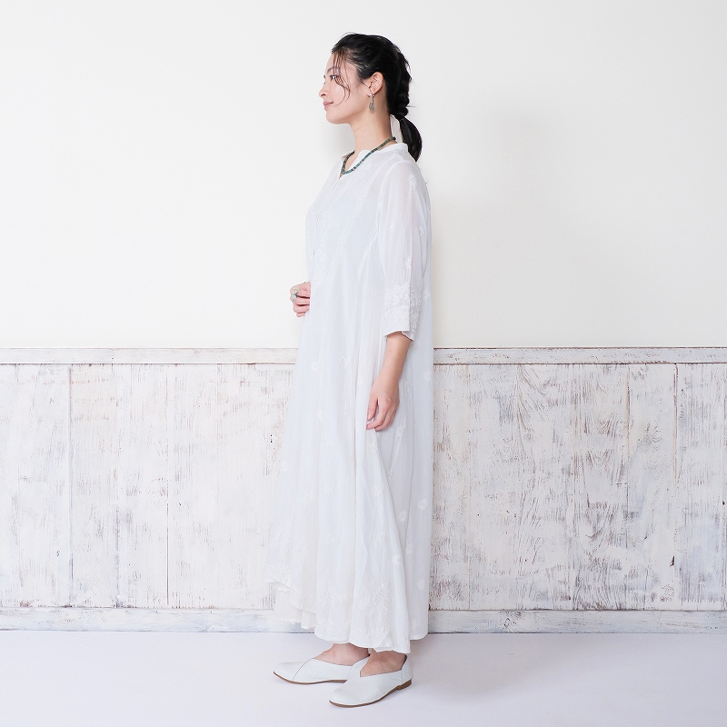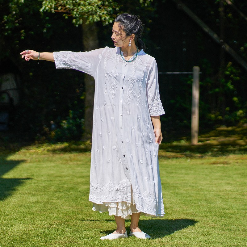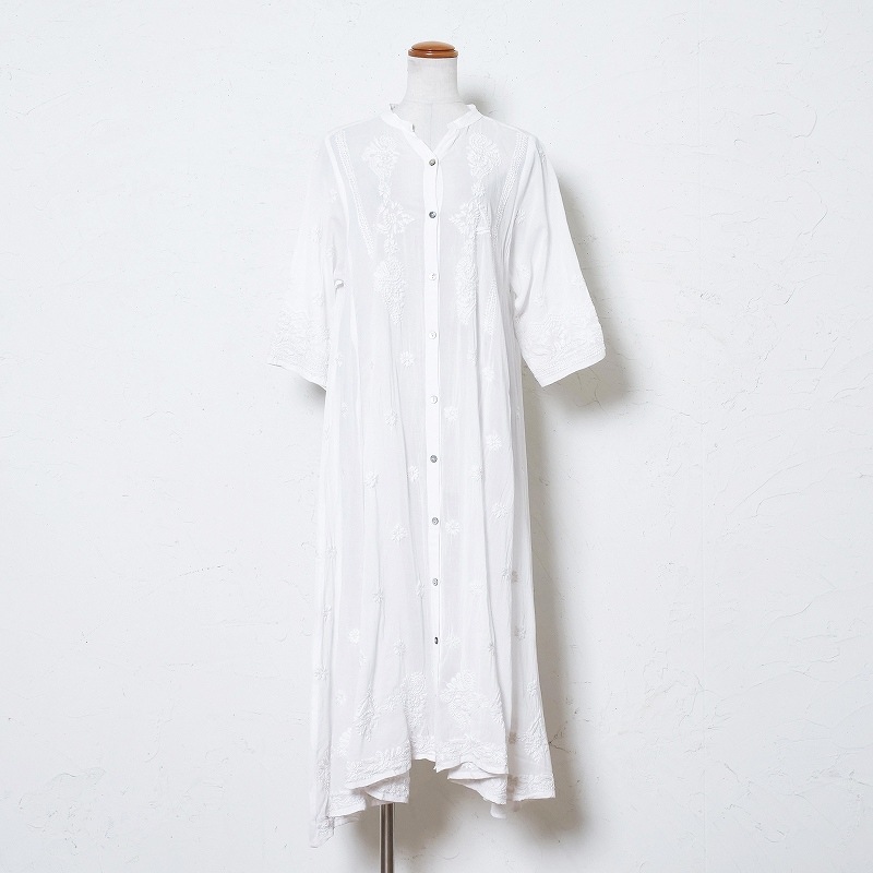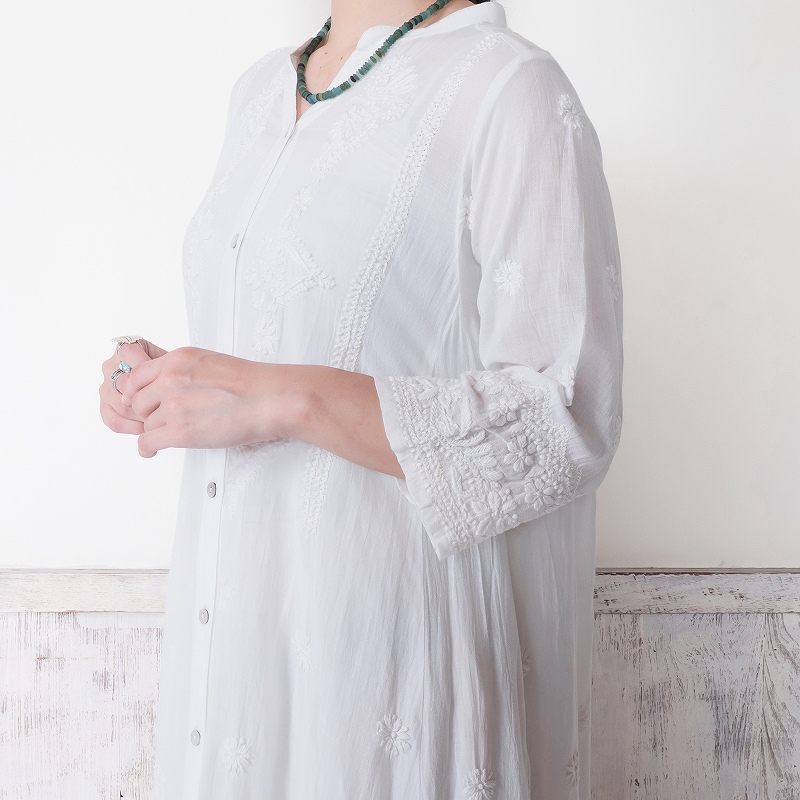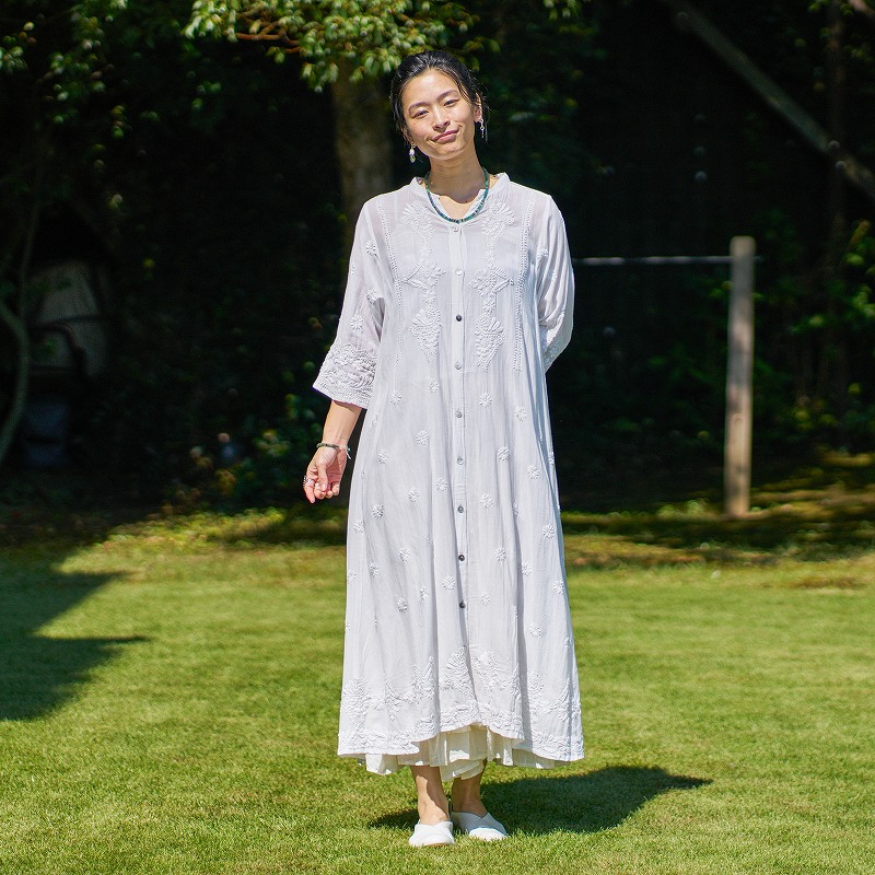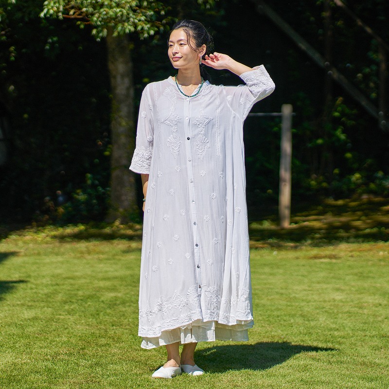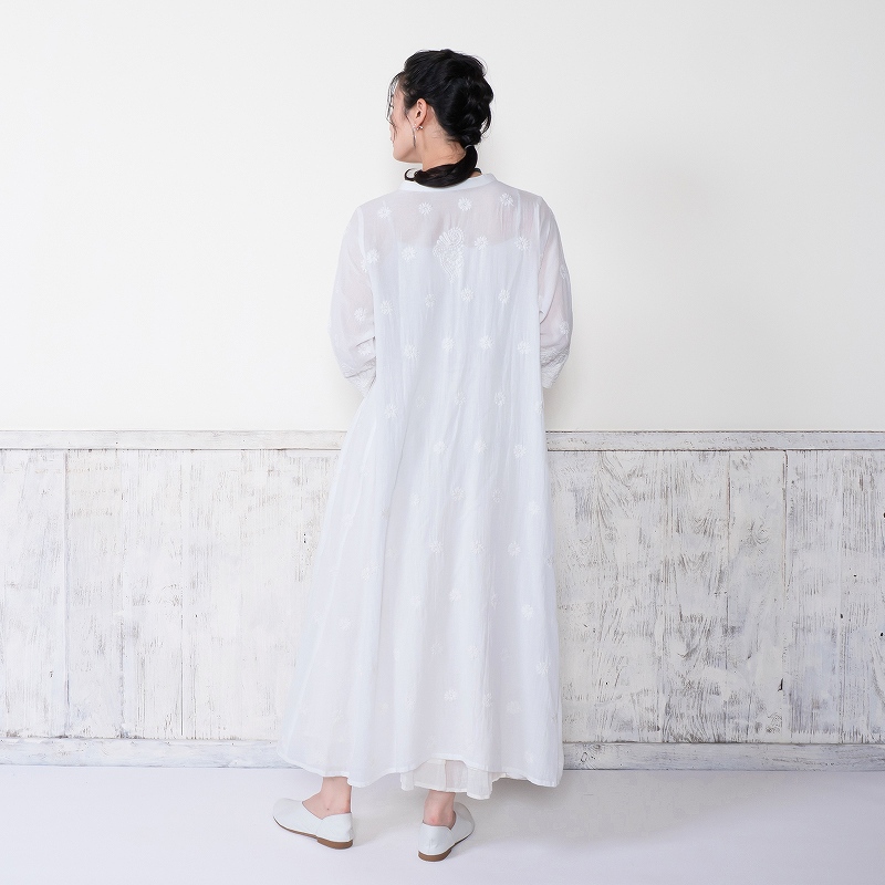 ラクノウ刺繍が施されたロング丈の前あきワンピース。スタンドカラーがすっきりとした爽やかな印象をプラスします。軽やかな透け感のある生地を使用した清潔感のあるアイテムです。生地は自然から得たモチーフを繊細な刺繍で装飾しています。柔らかく立体感のある刺繍は手刺繍ならではの丁寧な仕上がりです。合わせるボトムスで印象がガラリと変わるアイテムで、爽やかな雰囲気あふれるスタイリングでデイリースタイルを明るく彩ります。