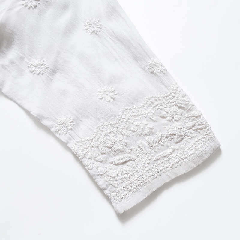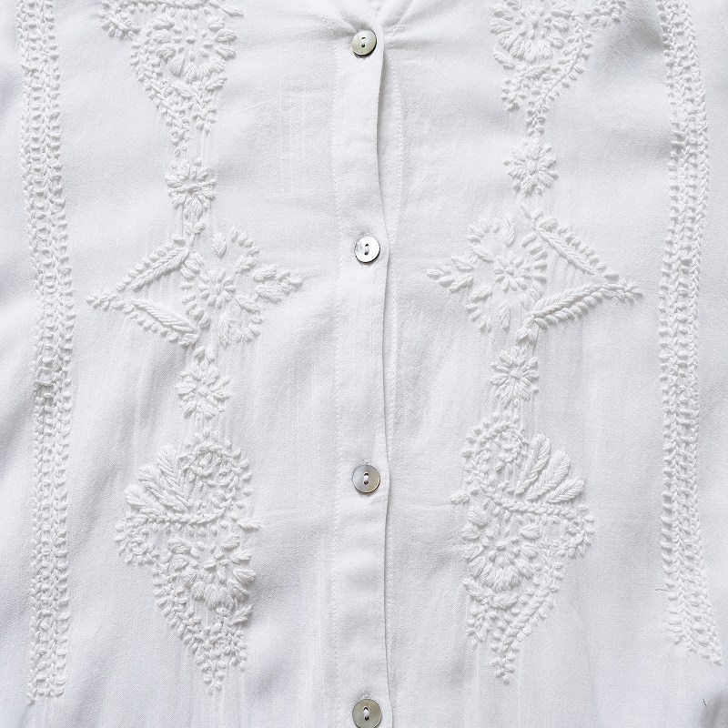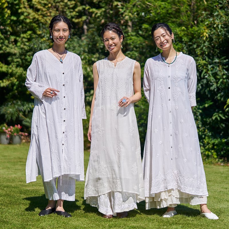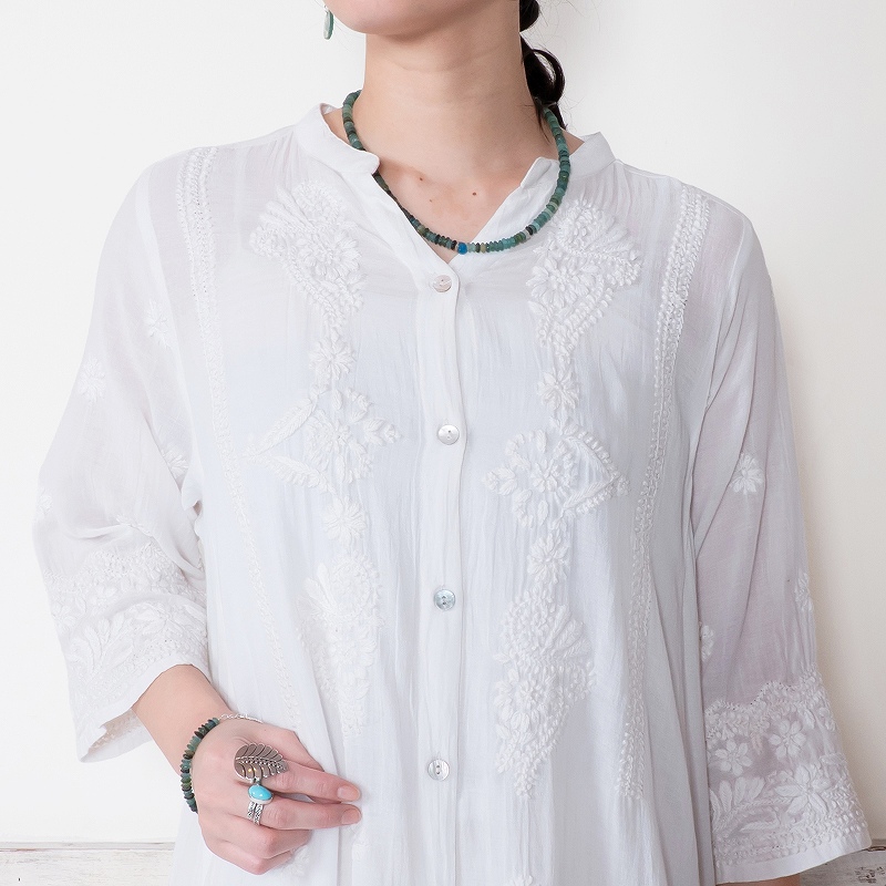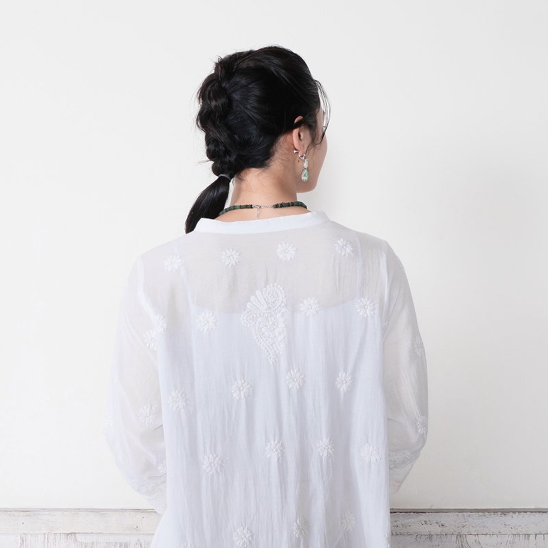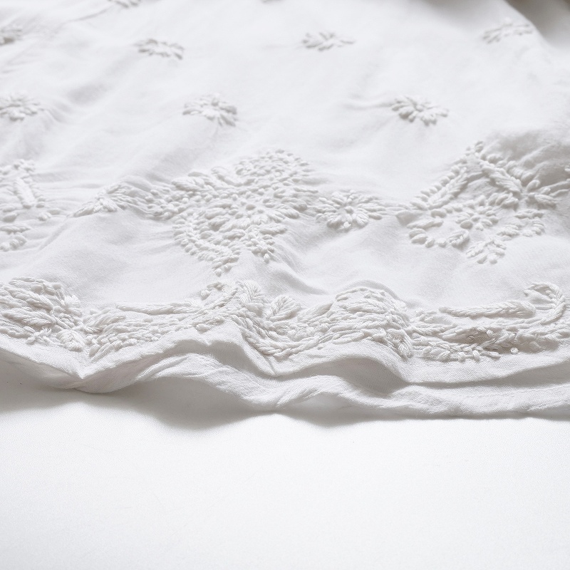 インドのウッタルプラデーシュ州にあるラクノウ(ラクナウ)という町の伝統的な手刺繍です。別名でチカン刺繍とも呼ばれています。 チカンとは「上質な綿で刺繍された」という意味で、400年もの長きに渡って受け継がれてきた伝統刺繍です。繊細な模様と立体感のある美しい刺繍の全ては女性たちにより施されています。時間をかけて施された刺繍は刺し子によってそれぞれに違った表情を魅せ、女性たちの手仕事のぬくもりが伝わってくるようです。