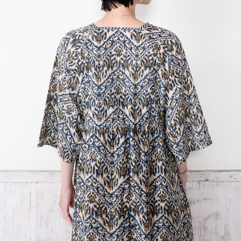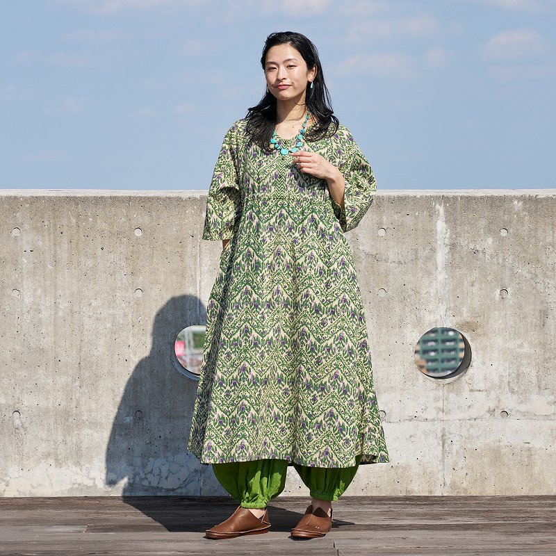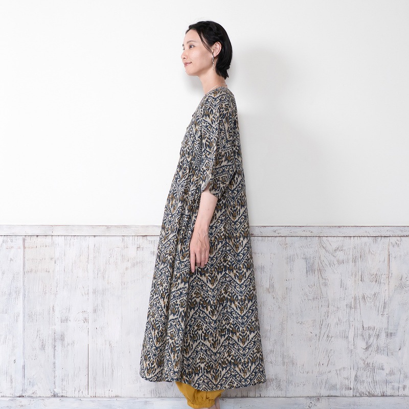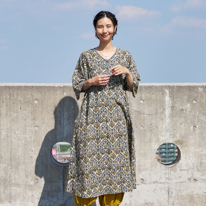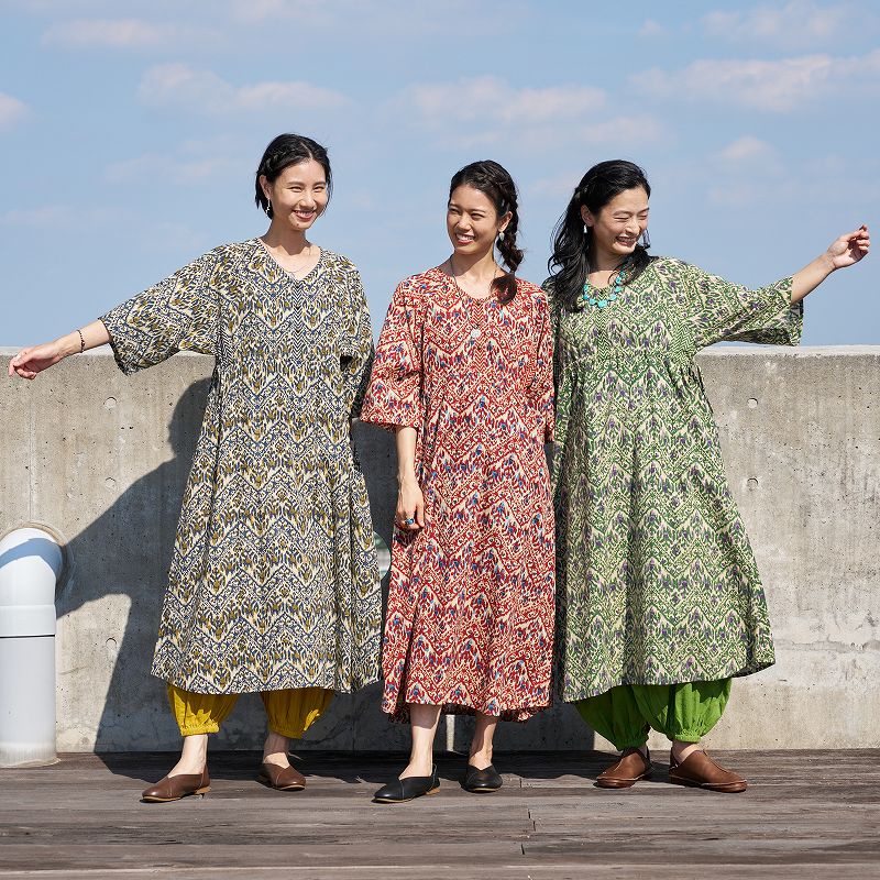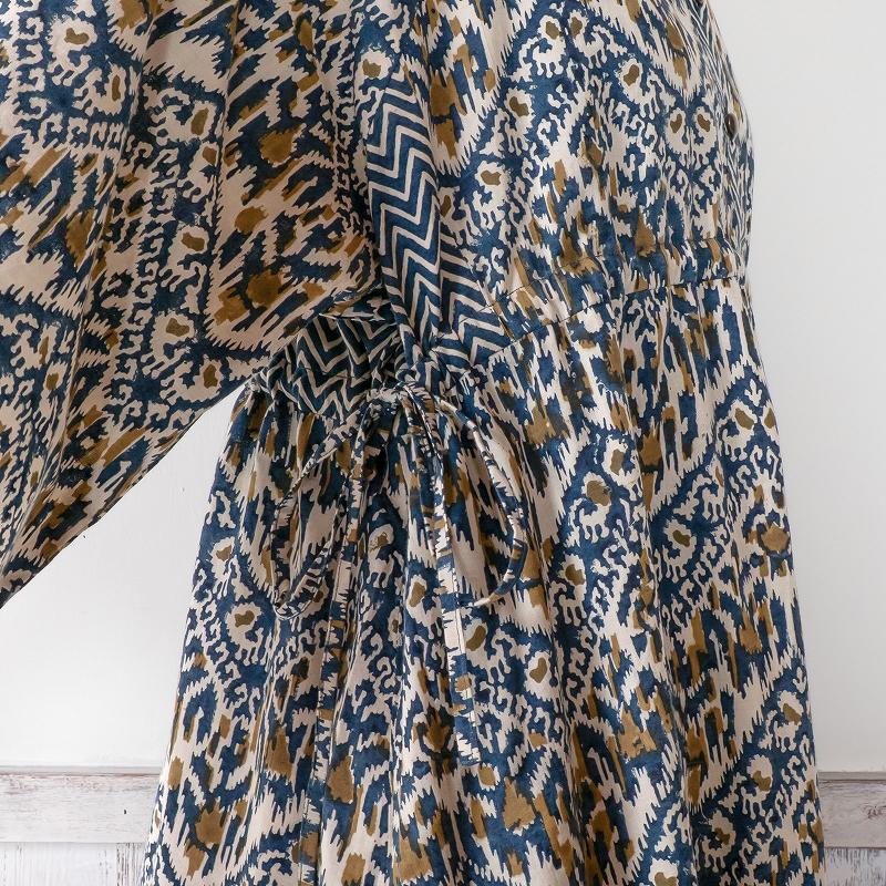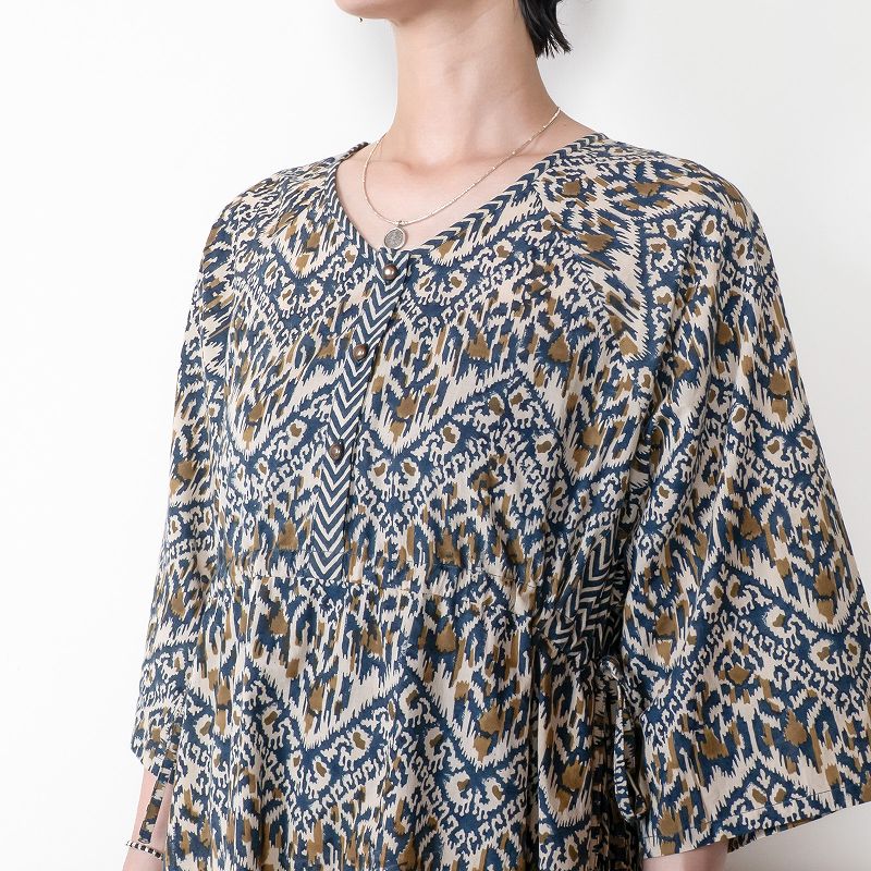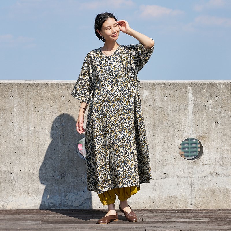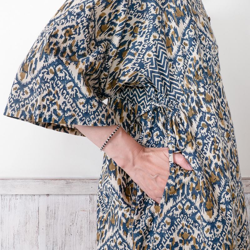 イカット柄をモチーフにしたブロックプリントが、甘さを抑えた大人の雰囲気を演出します。ウエストには紐が付いていてブラウジングできるデザインで、お好みのスタイルが楽しめます。手作業で仕上げられたプリントには、版のずれやかすれがあり、手仕事ならではの温もりが感じられます。3色展開で、お好みのカラーをお選びいただけます。