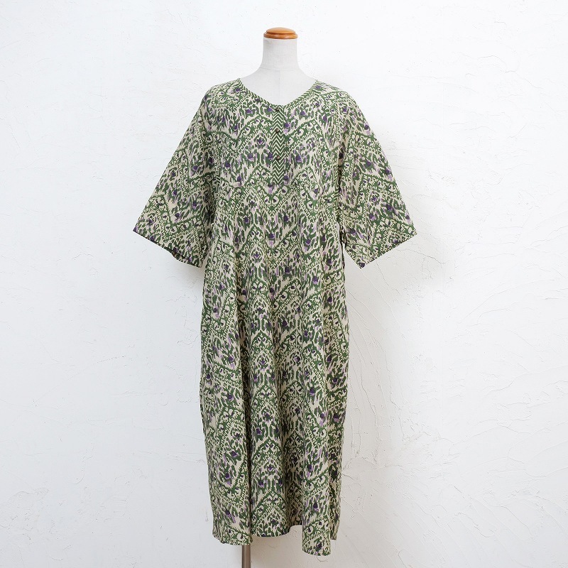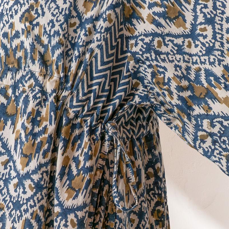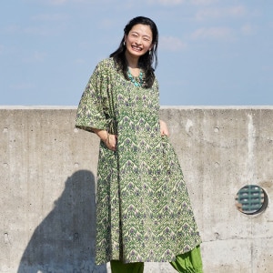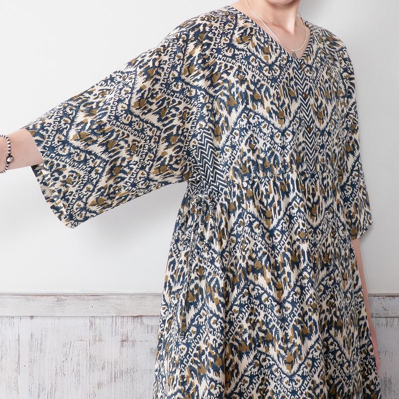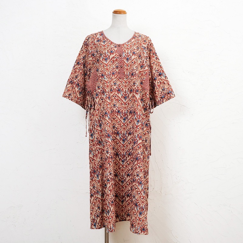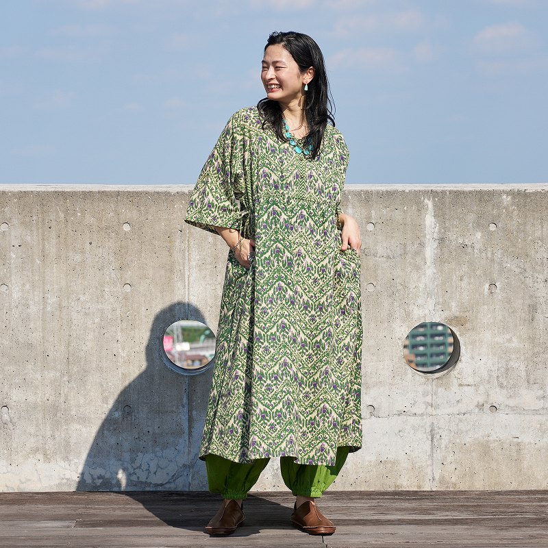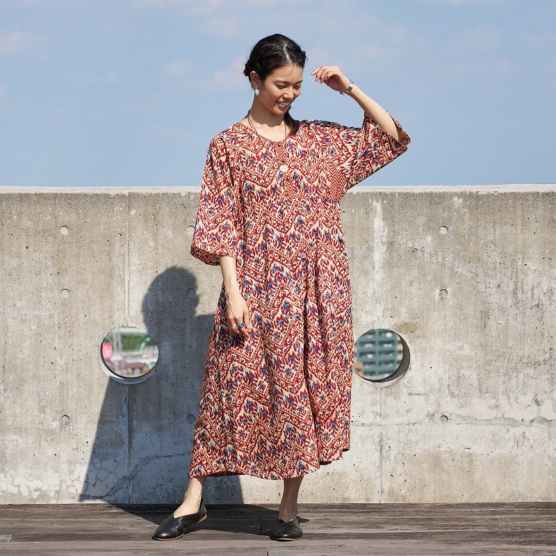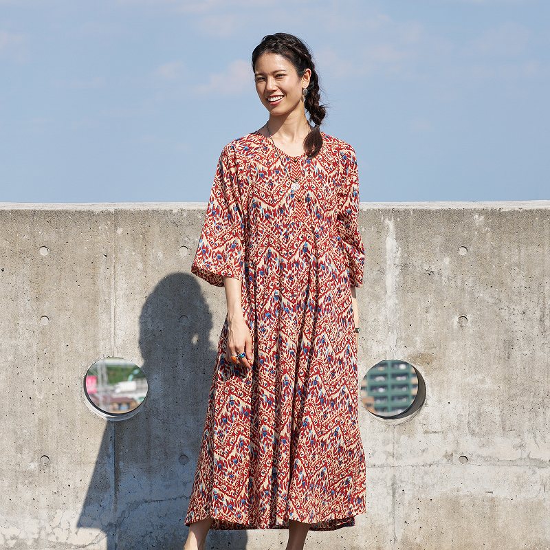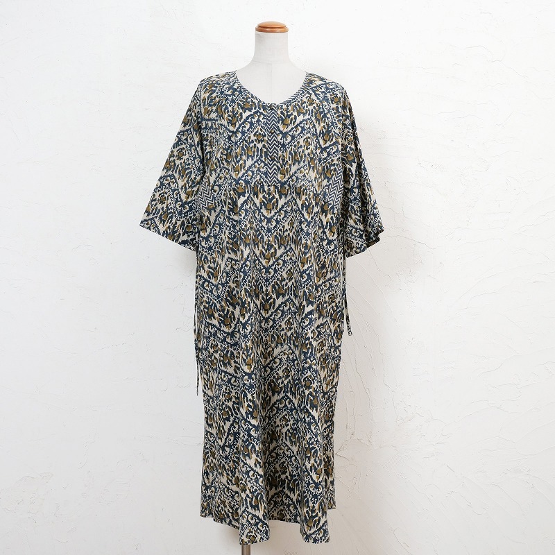 イカット柄をモチーフにしたブロックプリントが、甘さを抑えた大人の雰囲気を演出します。ウエストには紐が付いていてブラウジングできるデザインで、お好みのスタイルが楽しめます。手作業で仕上げられたプリントには、版のずれやかすれがあり、手仕事ならではの温もりが感じられます。3色展開で、お好みのカラーをお選びいただけます。