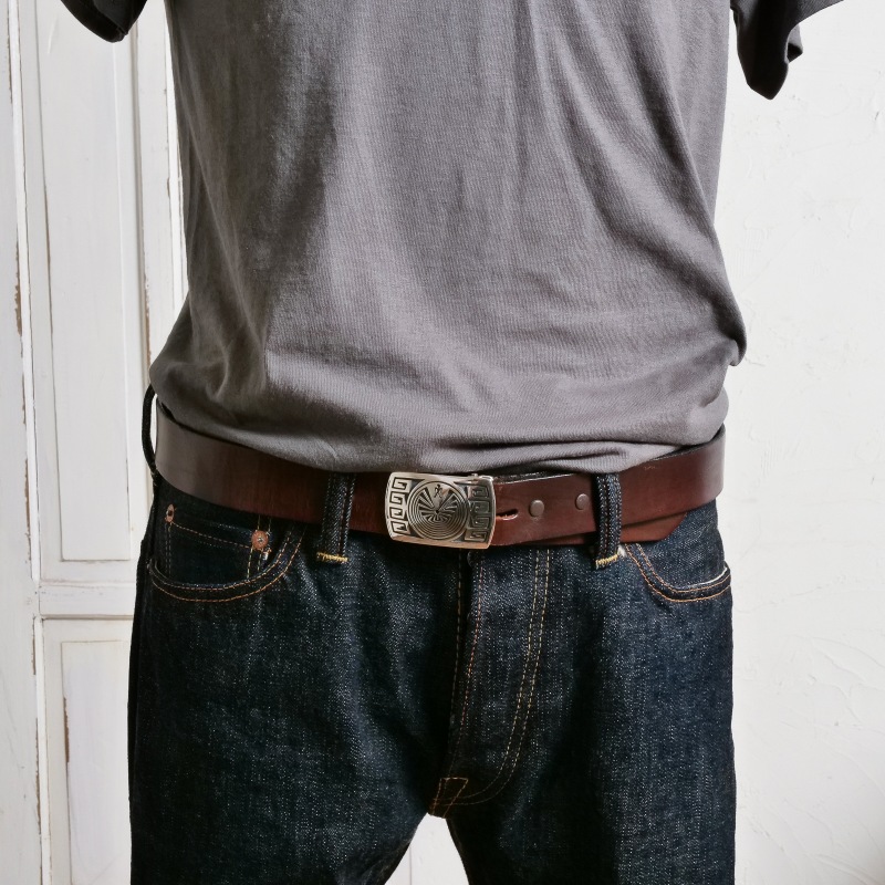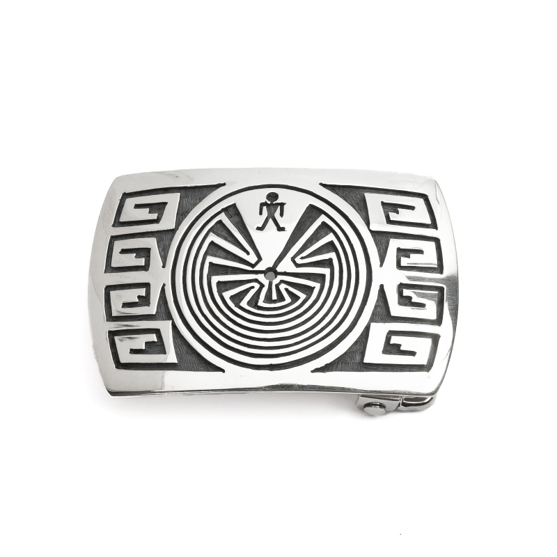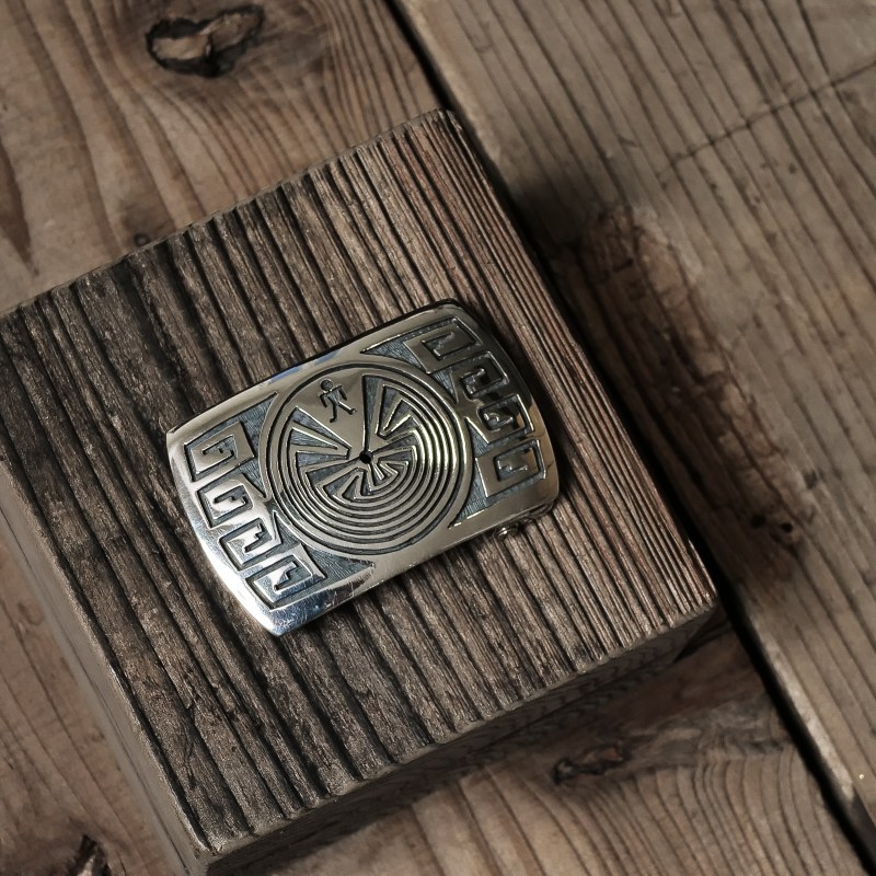 ホピ族アーティスト、パットテワウィナのオーバーレイバックルです。身に着けやすい小ぶりのバックル、鏡面シルバーの中心にマン・イン・ザ・メイズが丁寧なカッティングで見事に切り出されています。両サイドは水の流れで装飾され、ホピらしいバックルに仕上がっています。