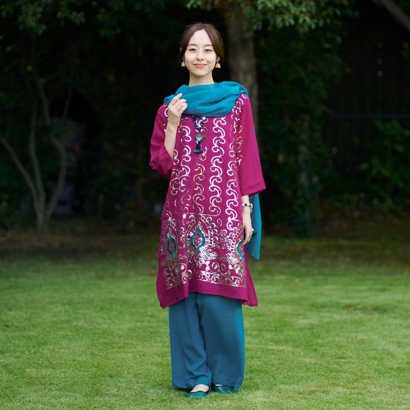 ストールとワンピース、パンツの3点セットです。ワンピースの前身頃にはスパンコール刺繍が施され、裾の部分にはクジャクの羽のようなモチーフが施されています。パンツとストールはピーコックグリーンのシンプルな無地で仕上げ、ワンピースとのコントラストが際立つようなスタイルになっています。ワンピースはサイドに深めのスリットが入っていて動きを制限せず、涼しく心地よく着こなすことができます。ストールの巻き方には決まりが無く、様々な巻き方でスタイリングを楽しめます。