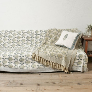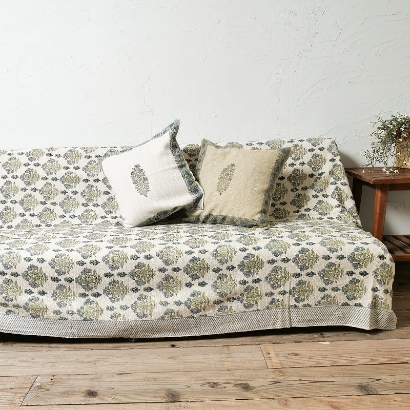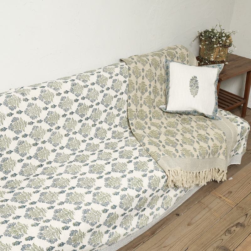ざっくりとした手織りコットン生地に、ハンドブロックプリントを施したマルチクロス。適度な重みがあり、ずれにくく使いやすいのもポイント。ナチュラルなインテリアにもすっとなじみます。落ち着いたベースカラーにブルーの草花模様が映える、上品で取り入れやすいアイテムです。同じシリーズのクッションカバー(CSC2061T)と合わせて使うのがおすすめ。