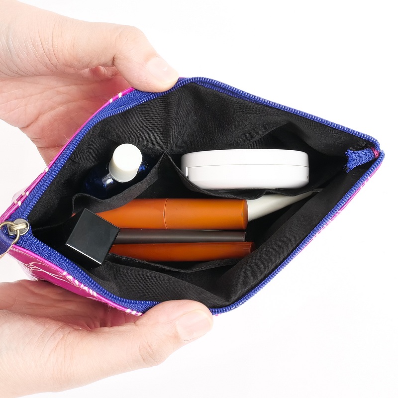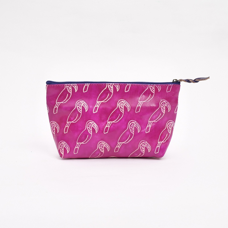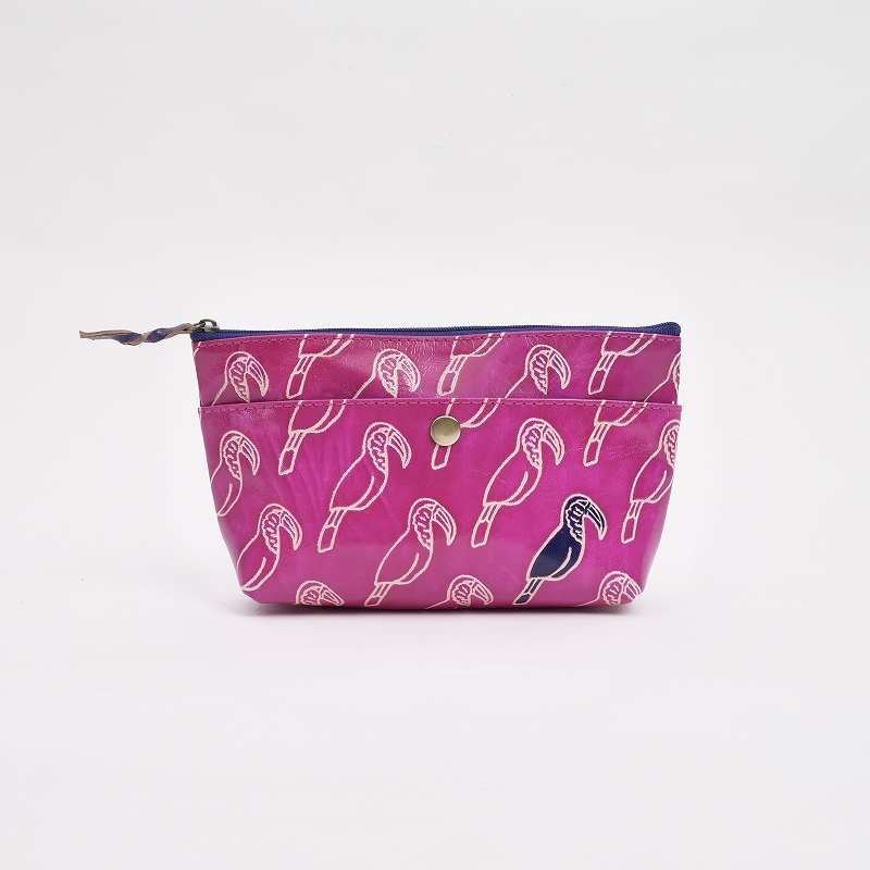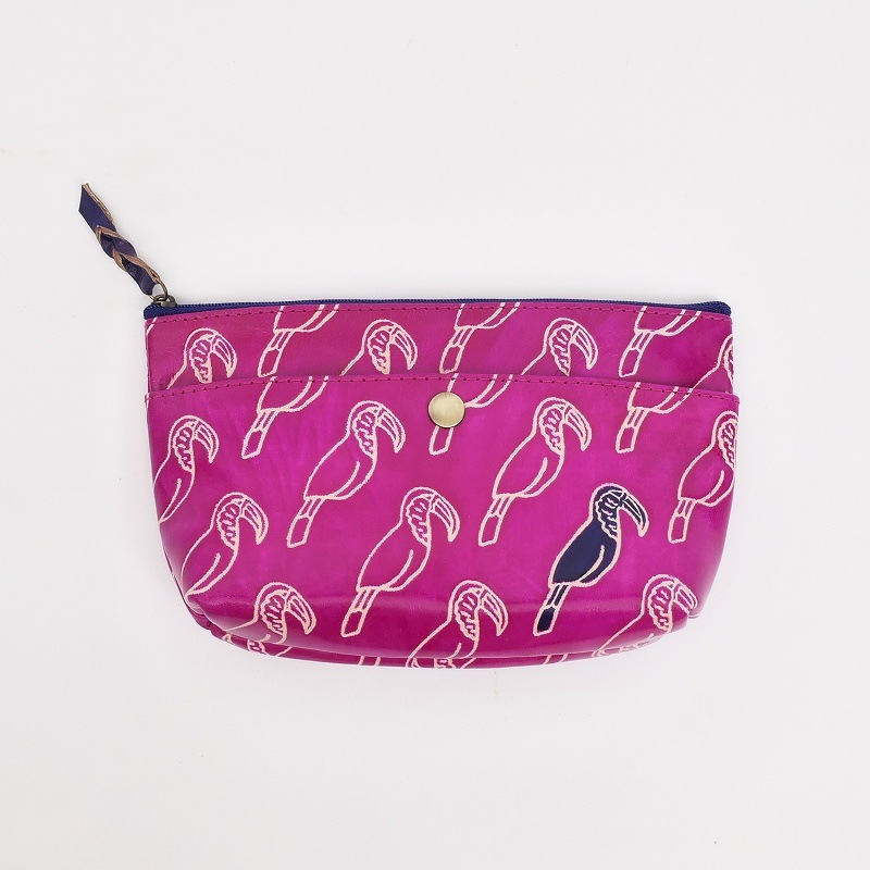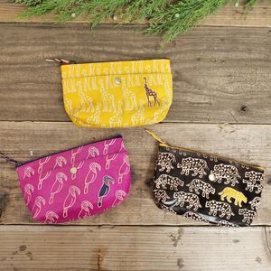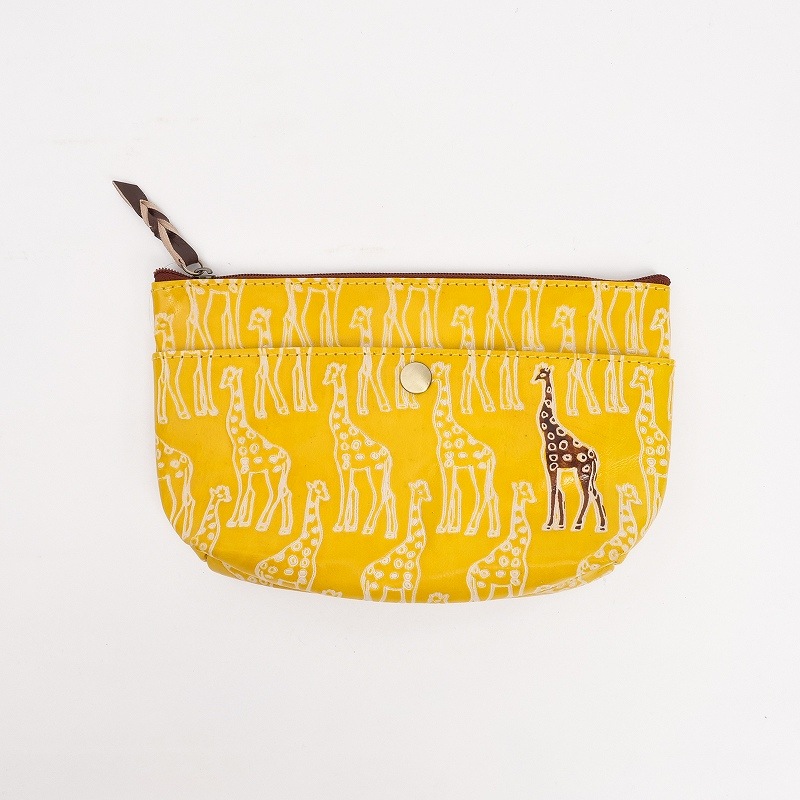 アニマル柄の山羊革ポーチ。イエローはキリン、ピンクはオオハシ、ブラックはヒョウの連続柄で、1体だけ色付きになっているのがさりげないポイント。小ぶりな化粧ポーチサイズながら、外側に1つ、内側に5つのポケット付きで機能性も充実。大人でも取り入れやすい、遊び心のある可愛いアイテムです。