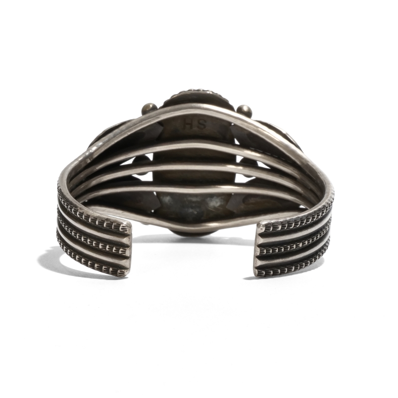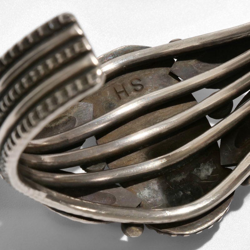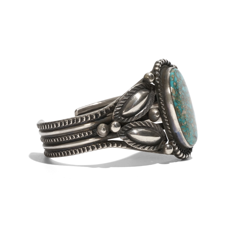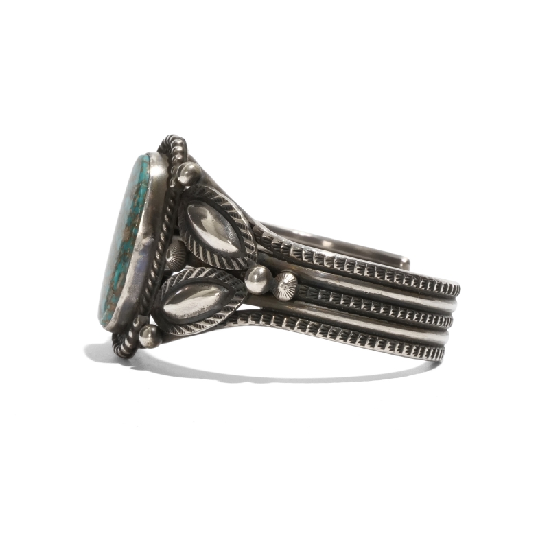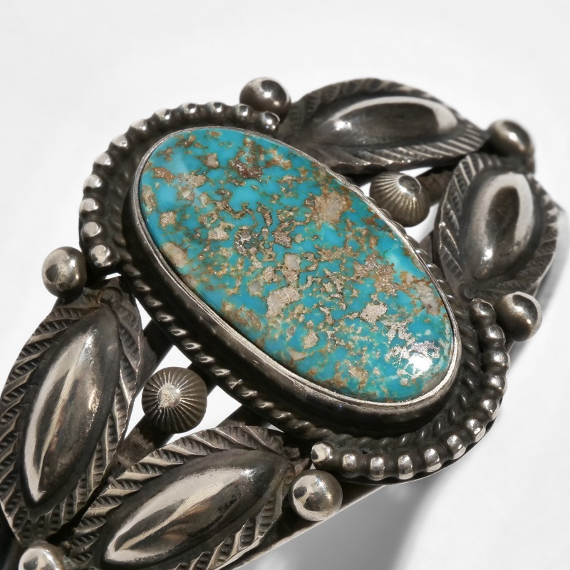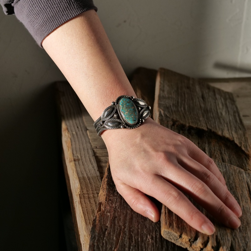 ナバホ族・ハーマンスミスのターコイズバングルです。ハーマン作品では珍しいクラシックワイヤーワーク作品。トップには鮮やかなブルーにベージュと赤茶のマトリックスが吹雪のように散る、ユニークな紋様のパイロットマウンテンターコイズ。艶やかな大粒石をシルバードロップ、リーフバンプアウトでクラシックに装飾しています。ワイヤーにも細かなスタンプワーク、渋い銀面で威圧感がなく伝統的なナバホスタイルをじっくり味わえる、経年変化も楽しみな1点。手首サイズ小さめ、女性にもおすすめです。