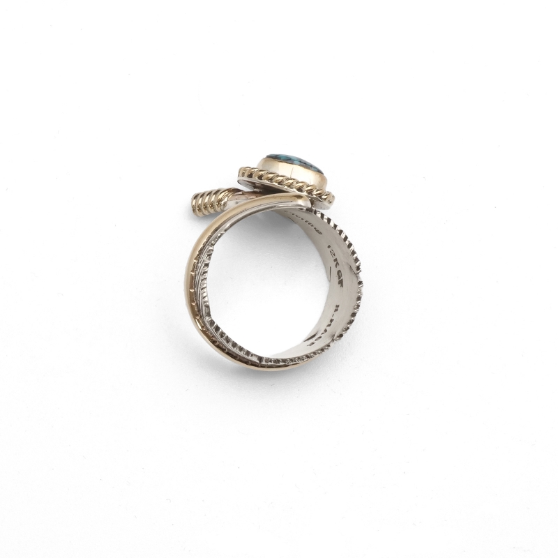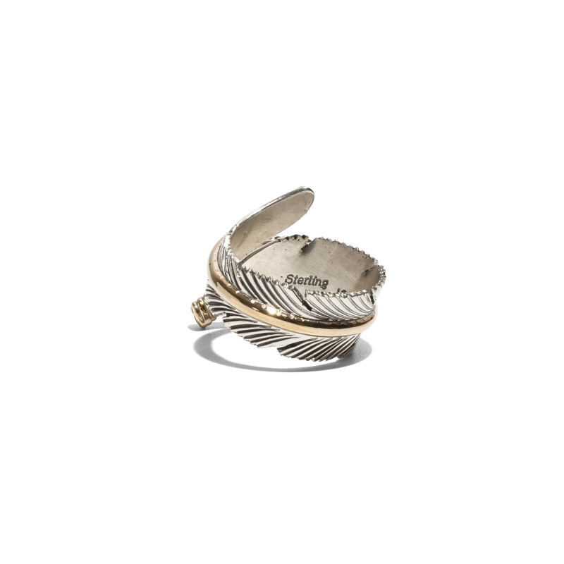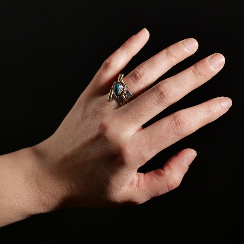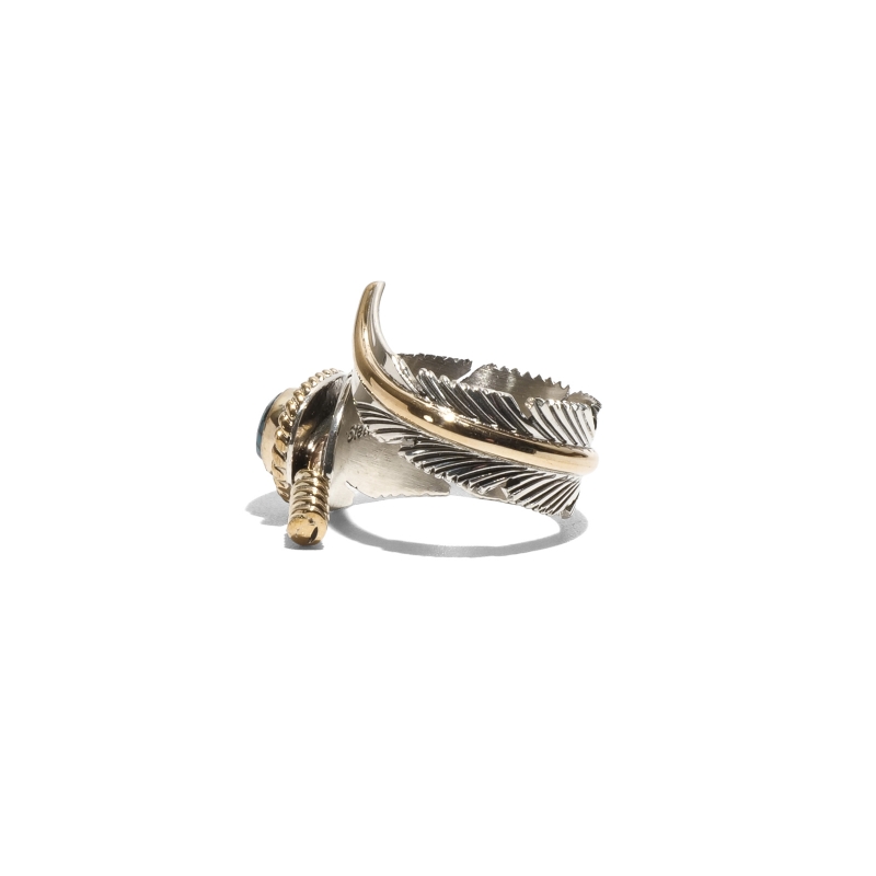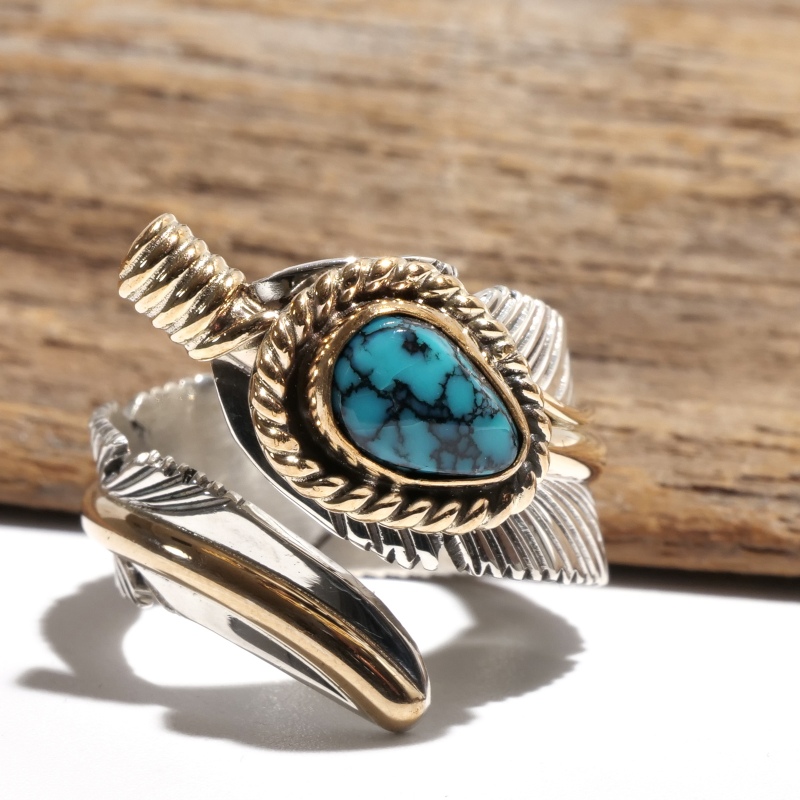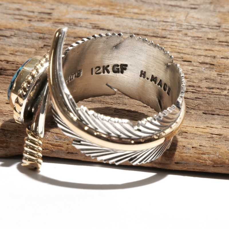 ハーヴィーメイスのターコイズ付きフェザーリングです。通常の12KGFモデルはフェザー芯のワイヤーのみがゴールドですが、こちらは特別仕様で石周りのベゼル・ツイストワイヤーも12Kゴールドフィルド。スパイダーウェブのクラウドマウンテンターコイズが華やかに映える1点となっています。ネイティブアメリカンにとってイーグルは神のメッセンジャーとされ、儀式の際にはイーグルフェザーは欠かせないアイテム。お守りとしてギフトやペアジュエリーとしてもオススメ、多少のサイズ調整が可能なスパイラルタイプです。