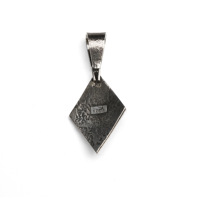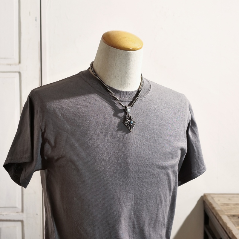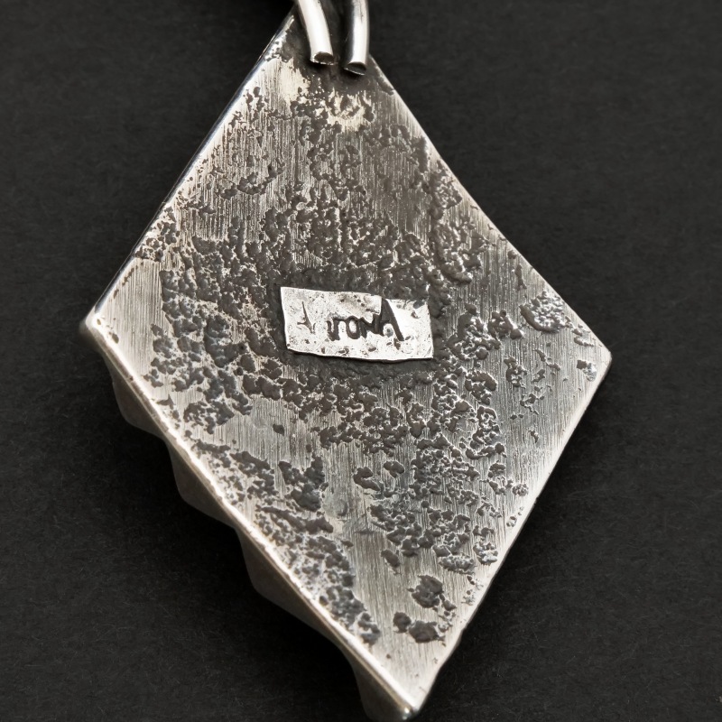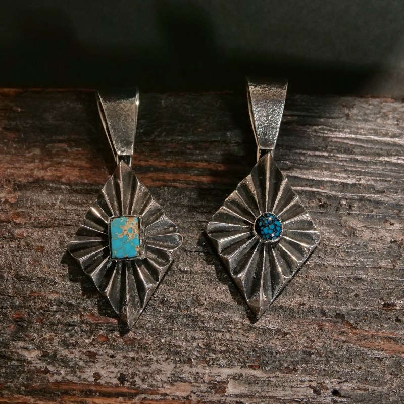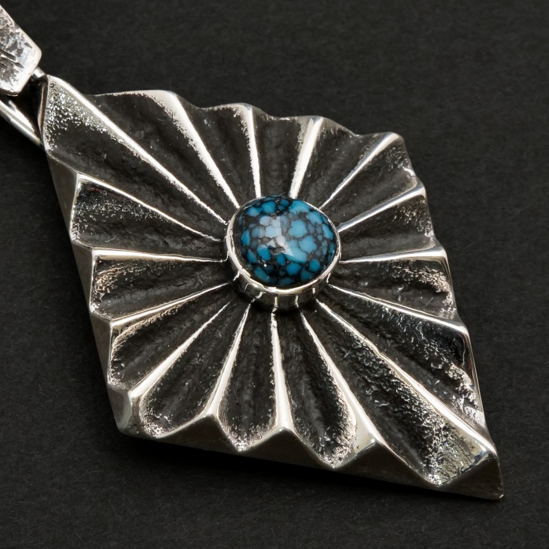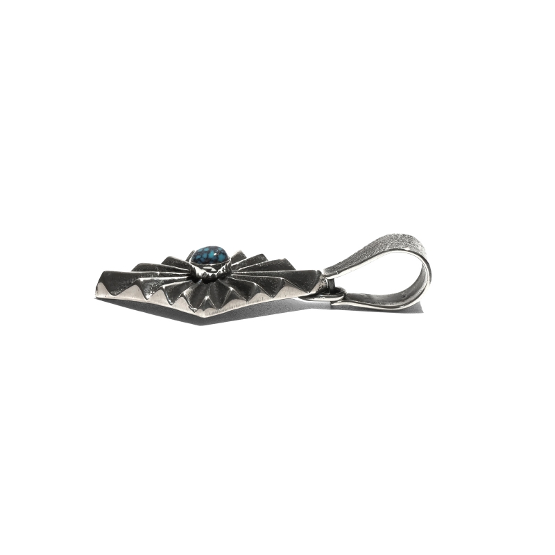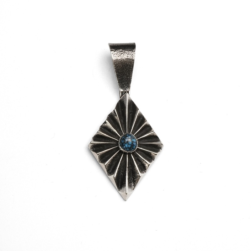 アーロンアンダーソンのトゥファキャストペンダントです。トップはフォーディレクション(=聖なる4つの方角)を表すダイヤモンド型、凹凸をくっきりと深く彫り上げたヘヴィサンバーストデザイン。中心には非常にレアなブラックスパイダーウェブ入りのキャンデラリアターコイズが存在感を放ちます。バチカンもトゥファキャストで鋳造した大きめもので高級感と渋みをプラス、太めのナバホチェーンやシルバービーズネックレスと合わせたい1点です。