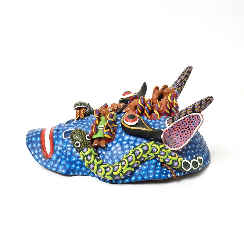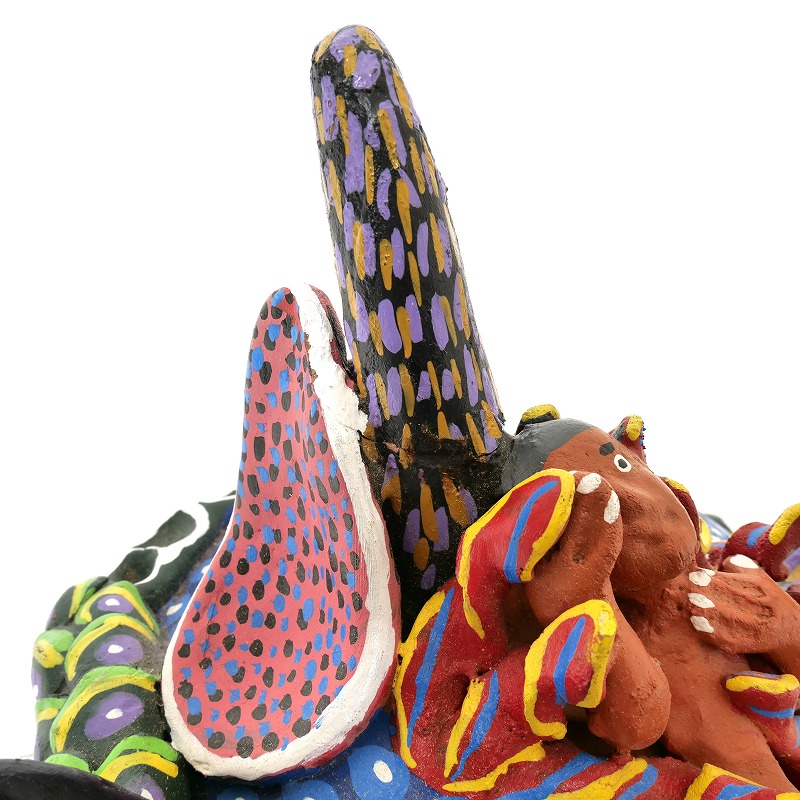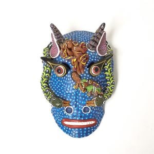 こちらは大きなお面。顔の上には人のような生き物が二体。ただ乗っているだけでなく、顔から伸びた手のようなものに掴まれているようにも見える、意味深な造形。両耳には蛇、角の横には耳のような突起。サイズ、色使い、デザインすべてに強いインパクトを放つ存在感抜群のディアブリトスです。修復箇所が多く見られますが、それ以上に強い存在感を放つ作品です。インテリアにおすすめ。