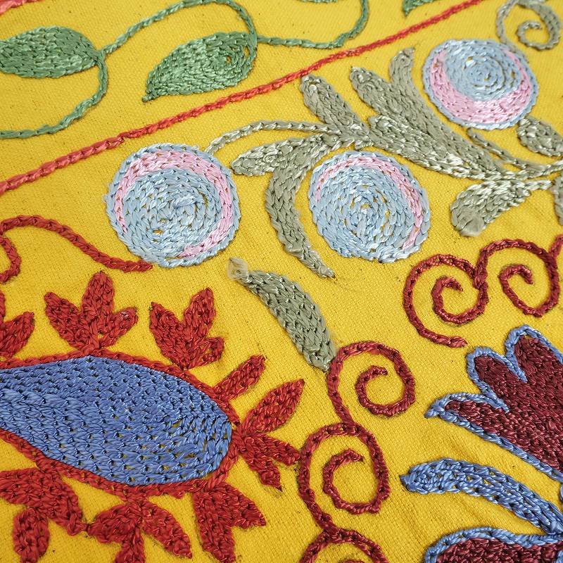 スザンニ(スザニ)は、ウズベク語で「刺繍、針仕事」という意味の言葉で、中央アジアの遊牧民を中心に伝わる刺繍布のことを指します。カザフスタンからウズベキスタン、キルギス、タジキスタン、トルクメニスタン、アフガニスタンにかけて広く見られる伝統技法で、チェーンステッチやカウチングステッチによってびっしりと施された刺繍には立体感があり、中央アジアならではの美しい配色や繊細な絵柄が表現されています。この刺繍は母から娘へと受け継がれ、別途カバーや礼拝用の布など家庭内で使われる他に嫁入り道具の一つにもなってきました。代表的なモチーフとその意味・太陽、月 : 生命力、宇宙、時間・花(チューリップ、カーネーションなど) : 美、純粋さ、愛・葡萄やザクロ : 豊穣、多産、繁栄・唐草模様(蔓) : 成長、永続、家庭のつながり・渦巻きや目 : 魔除け、悪意からの防御