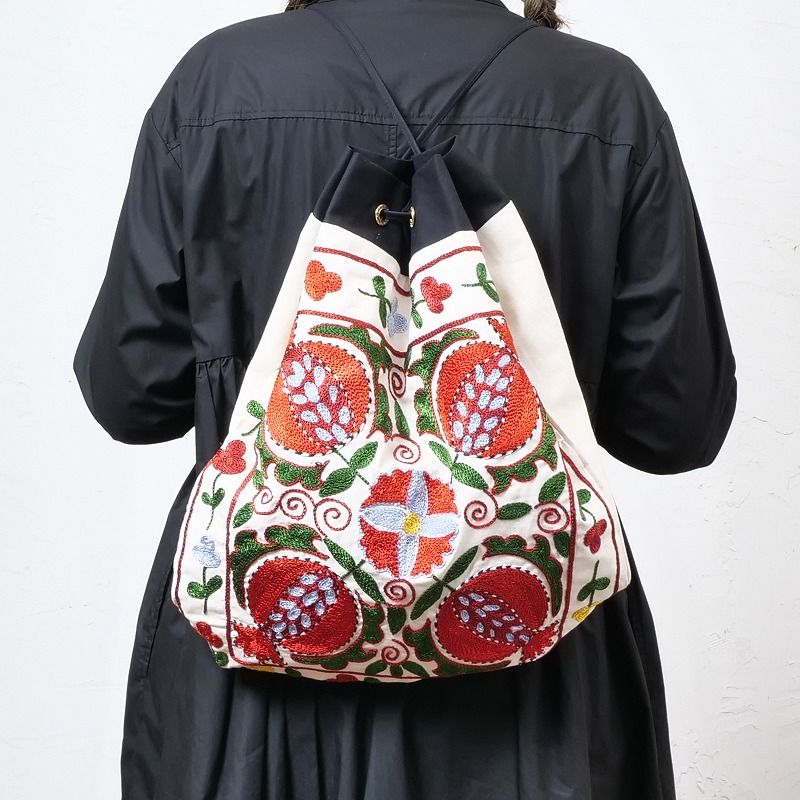 ウズベキスタンで作られたスザニ刺繍生地を使ったリュック。ざっくりとしたナップサック型でA4ファイルが縦に収まるサイズ感。ショルダー部分は細めの紐仕様になっています。背面に使われているスザニ刺繍生地はすべて1点もの。花やザクロなど、美や豊穣を意味する伝統的なモチーフが、色鮮やかに刺繍されています。ちょっとしたお出かけに使ったり、使わないときは壁に掛けてインテリアとして取り入れるのもおすすめ。現地で仕入れたローカル品のため、手仕事ならではのラフさが残りますが、美しいスザニ刺繍を身近に楽しめるアイテムです。