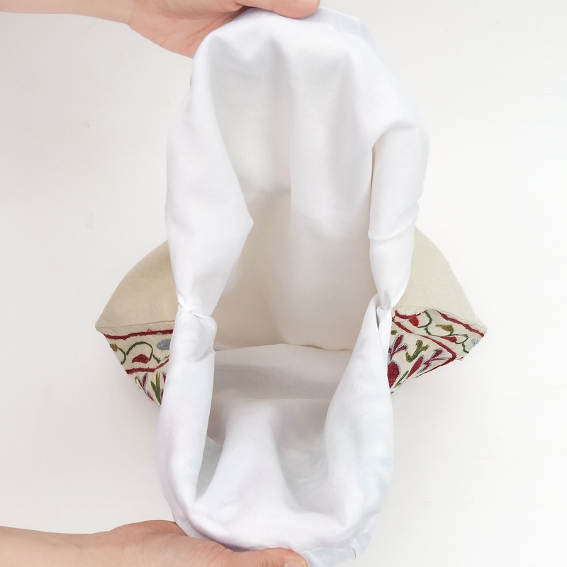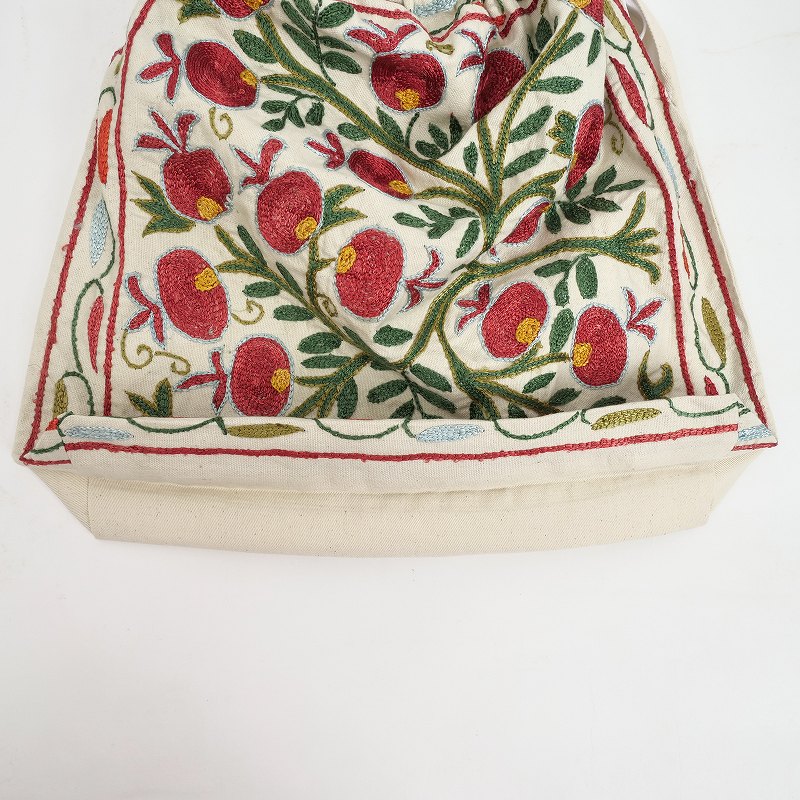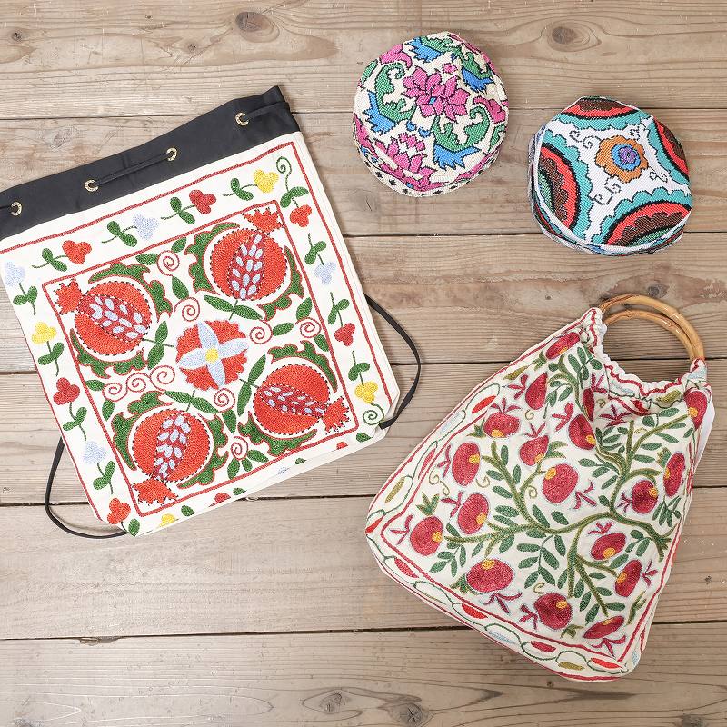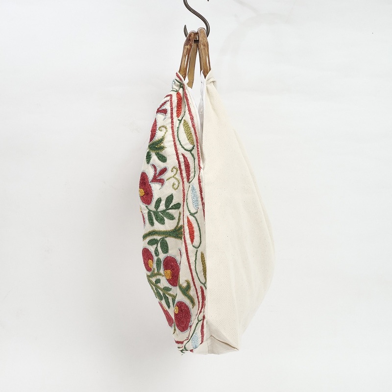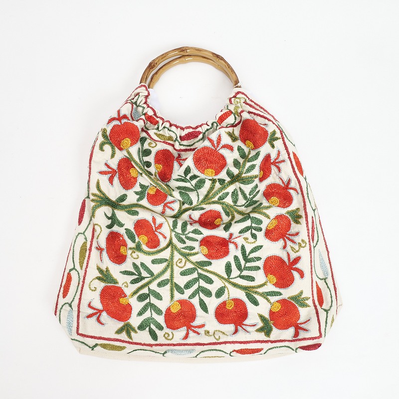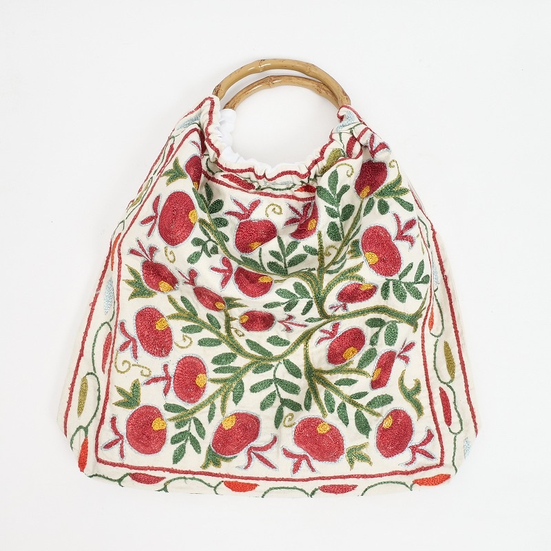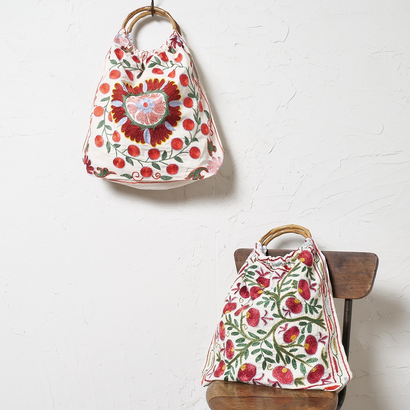 ウズベキスタンで作られたスザニ刺繍生地を使ったバッグ。バンブーハンドルとの組み合わせがレトロな印象で、刺繍の華やかさが引き立てます。A4ファイルを縦に収納でき、見た目以上に容量があるのも嬉しいポイント。花やザクロなど、美や豊穣を意味する伝統的なモチーフが、色鮮やかに刺繍されています。現地で仕入れたローカル品のため、手仕事ならではのラフさが残りますが、美しいスザニ刺繍を身近に楽しめるアイテムです。