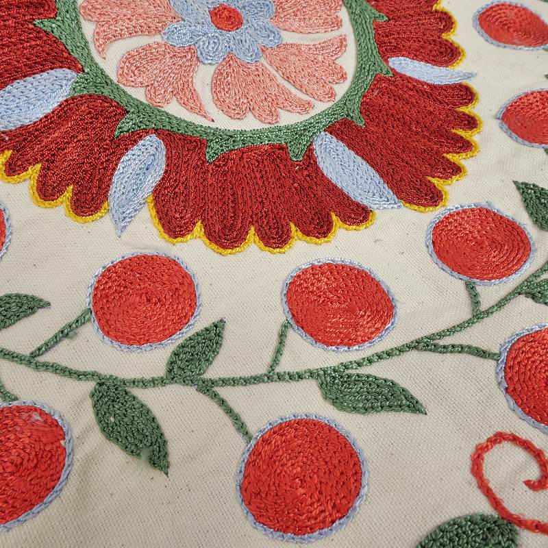 スザンニ(スザニ)は、ウズベク語で「刺繍、針仕事」という意味の言葉で、中央アジアの遊牧民を中心に伝わる刺繍布のことを指します。カザフスタンからウズベキスタン、キルギス、タジキスタン、トルクメニスタン、アフガニスタンにかけて広く見られる伝統技法で、チェーンステッチやカウチングステッチによってびっしりと施された刺繍には立体感があり、中央アジアならではの美しい配色や繊細な絵柄が表現されています。この刺繍は母から娘へと受け継がれ、別途カバーや礼拝用の布など家庭内で使われる他に嫁入り道具の一つにもなってきました。代表的なモチーフとその意味・太陽、月 : 生命力、宇宙、時間・花(チューリップ、カーネーションなど) : 美、純粋さ、愛・葡萄やザクロ : 豊穣、多産、繁栄・唐草模様(蔓) : 成長、永続、家庭のつながり・渦巻きや目 : 魔除け、悪意からの防御