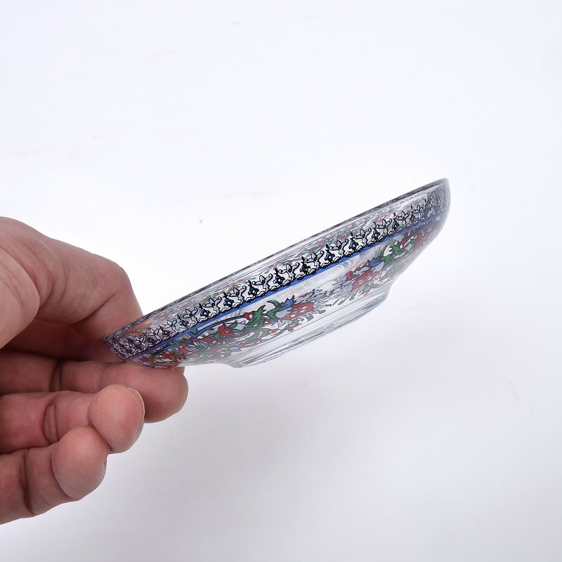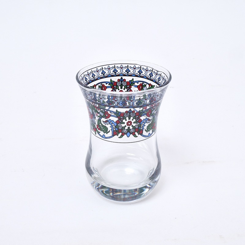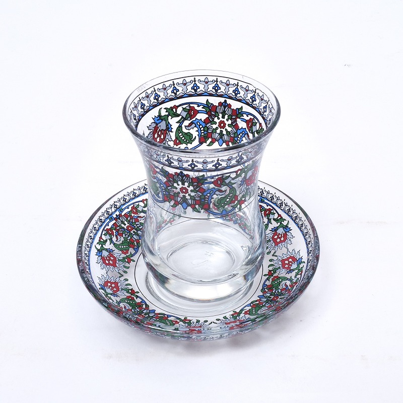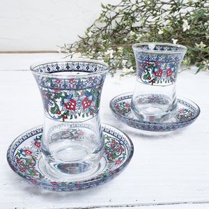 トルコ語で「チャイ」はお茶、主に紅茶のこと。濃く煮出した紅茶を小さなグラスに注ぎ、お湯で好みの濃さに調整して楽しむのがトルコ流です。チューリップ型で下がふっくらとしたフォルムは、チャイを美しく味わうための伝統的な形。口元とソーサーには、赤とグリーンを基調とした華やかなフラワーモチーフがあしらわれ、テーブルを明るく彩ります。日常使いはもちろん、ギフトにもおすすめのチャイグラスセットです。