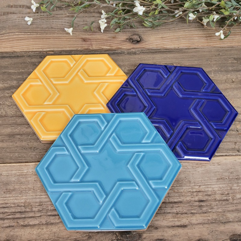 トルコの伝統文様をモチーフにした、六角形のタイル。表面に立体感のあるエンボス加工を施し、光の当たり方で陰影が生まれます。鮮やかなカラーは、空間のアクセントにぴったり。そのまま飾っても、コースターや鍋敷きとして使うのもおすすめです。組み合わせ次第で、壁やテーブルに異国の雰囲気を添えてくれます。