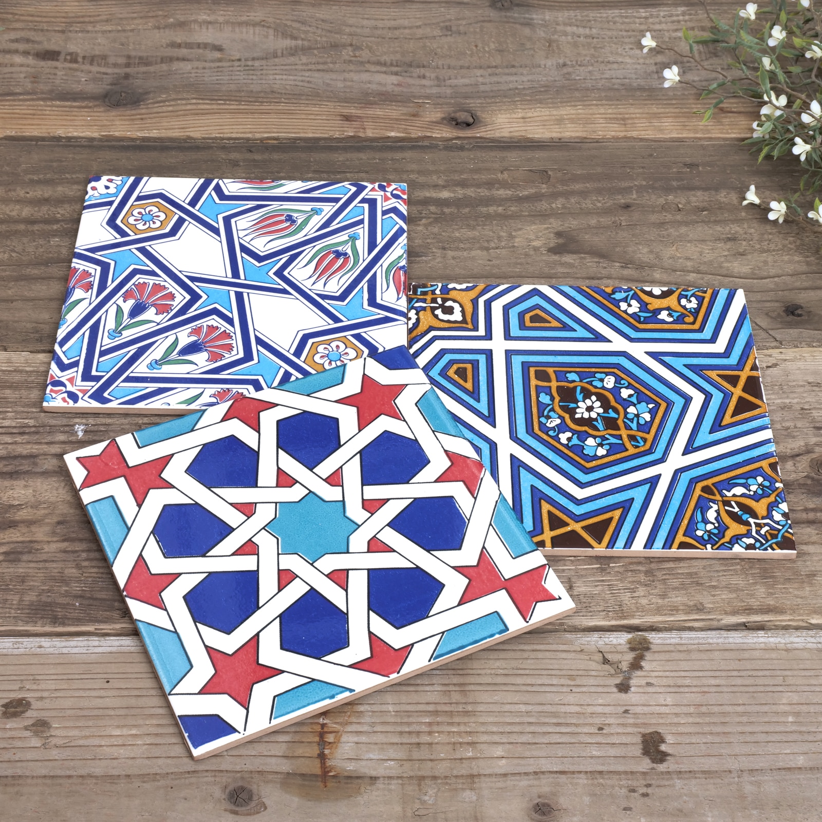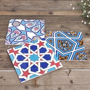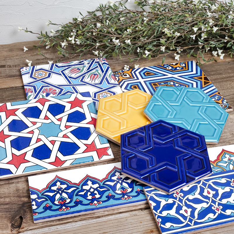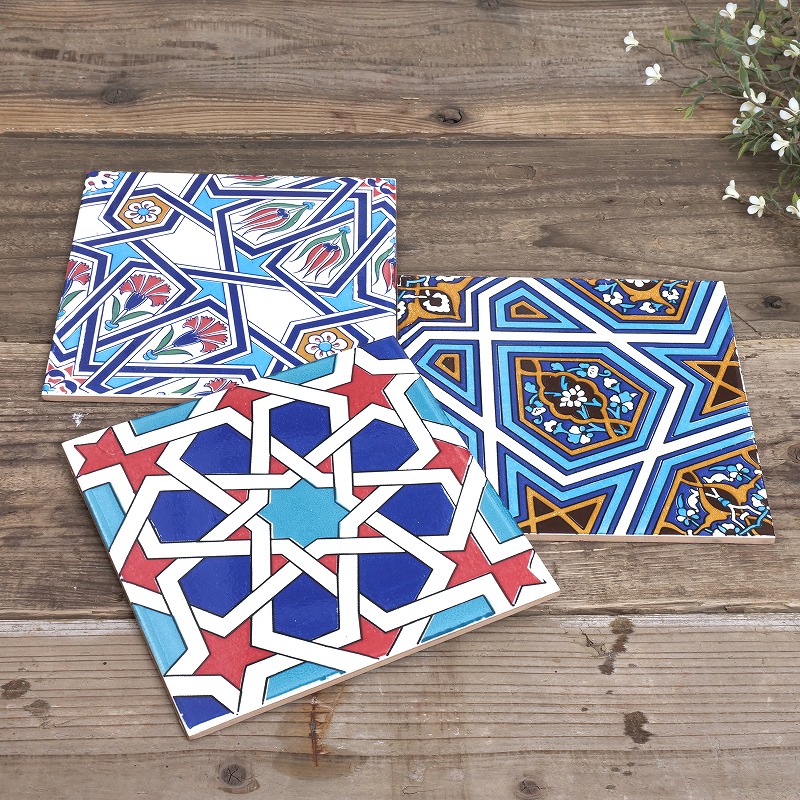 トルコの伝統的な幾何学模様や花文様を大胆にプリントしたスクエアタイル。一枚でも存在感のあるデザインです。整然とした幾何学の中に、植物モチーフが織り込まれた柄は、トルコタイルならではの美しさ。壁に立てかけたり、棚やテーブルのディスプレイに取り入れるだけで、空間がぐっと異国の雰囲気に。コースターや鍋敷きとして使うのはもちろん、複数枚を組み合わせて飾るのもおすすめです。