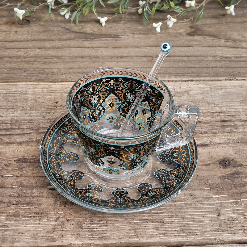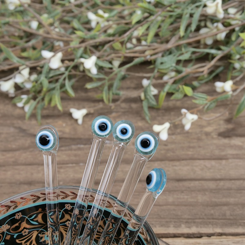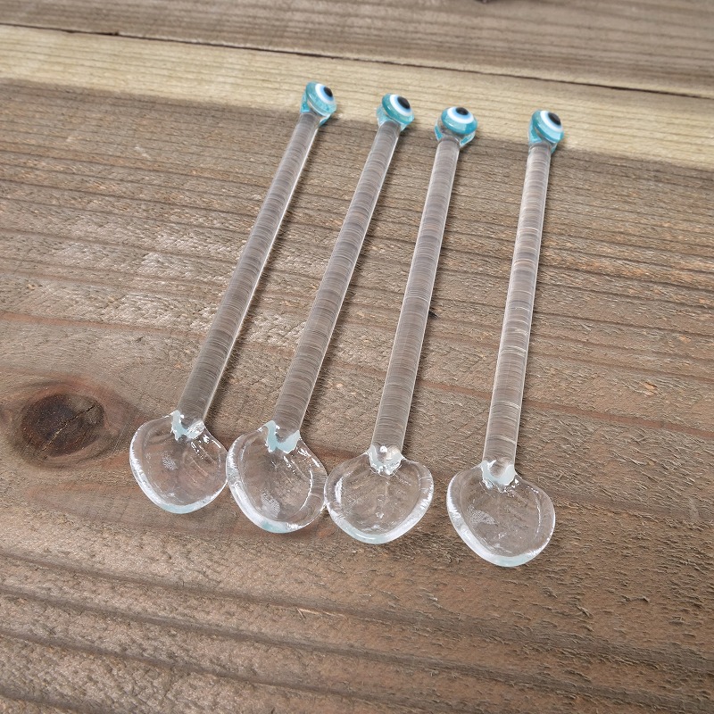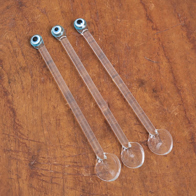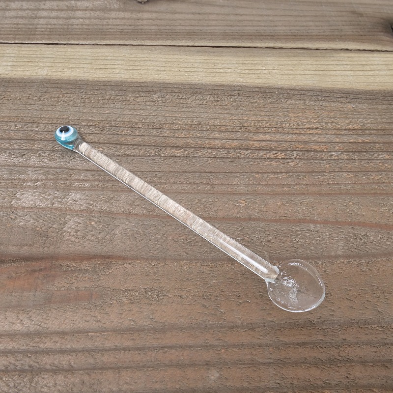 トルコのお守り「ナザールボンジュウ」をあしらった、透明感のあるガラススプーン。先端のブルーアイがさりげないアクセントになり、日常の中にそっと彩りを添えてくれます。スプーン部分には、葉っぱを思わせる繊細な模様入り。ジャムやはちみつ、シュガー用としてはもちろん、置いておくだけでも絵になるアイテムです。