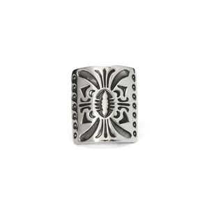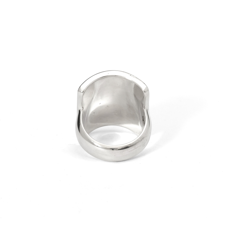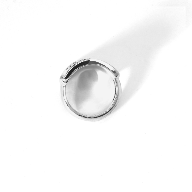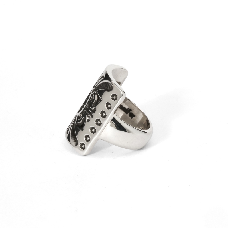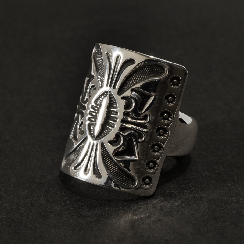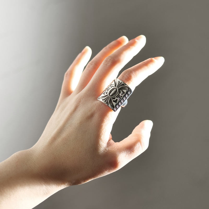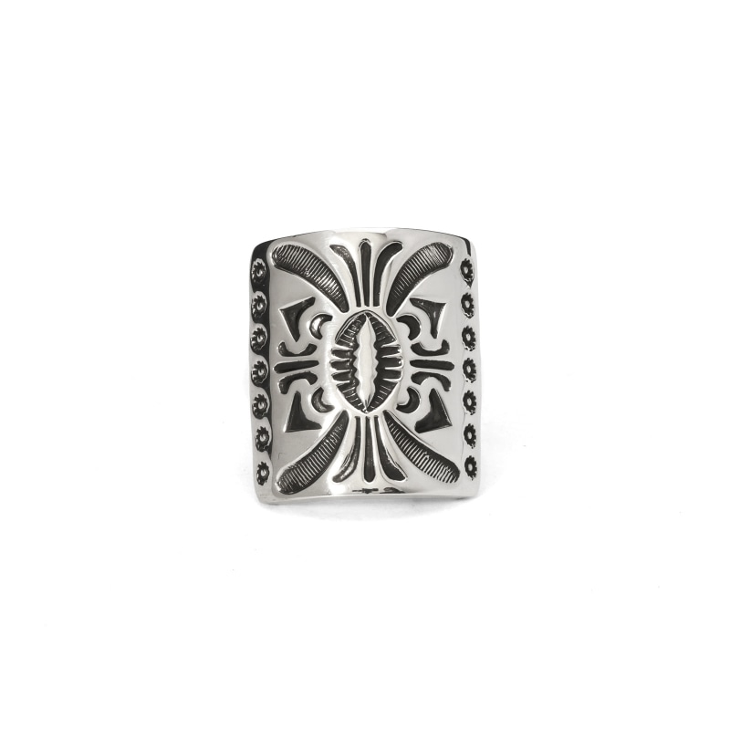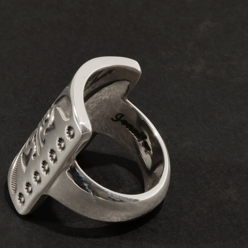ジェニファーカーティススタンプワークリングです。トップは弓矢を使う時に腕につけるボウガード、ナバホ語で『ケトー』と呼ばれるモチーフ。厚みのあるシルバーを鏡面に磨き上げ、ディープスタンプで守護の意味を持つ『ケトー』を力強く表現。背面は細身で、ボリュームがありつつ手指の動きを妨げません。伝統的なモチーフながらソリッドで現代的、ジェニファーらしいリングに仕上がっています。
