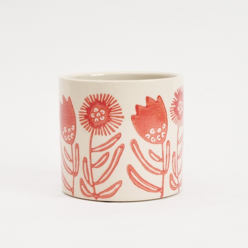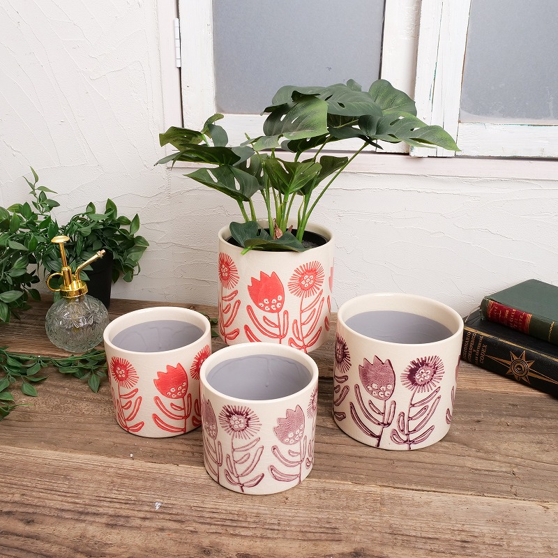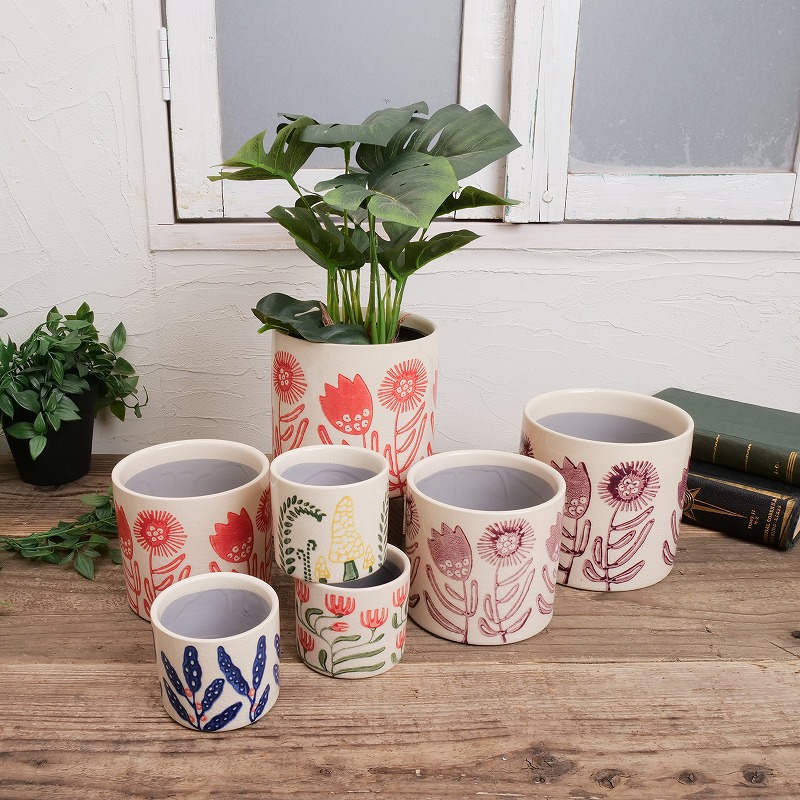 大胆に描かれた花柄が印象的なセラミックプランター。ナチュラルな色合いと優しい線が、グリーンをより引き立てます。4.5号対応で、中型の観葉植物にも合わせやすいサイズ感。リビングや玄関のアクセントにもおすすめです。サイズ違いで揃えれば、統一感のあるコーディネートが楽しめます。模様はひとつひとつスタンプを押して描かれているため、手作業ならではの絶妙なずれやカスレ、にじみがあります。やさしい揺らぎもこのシリーズの魅力です。