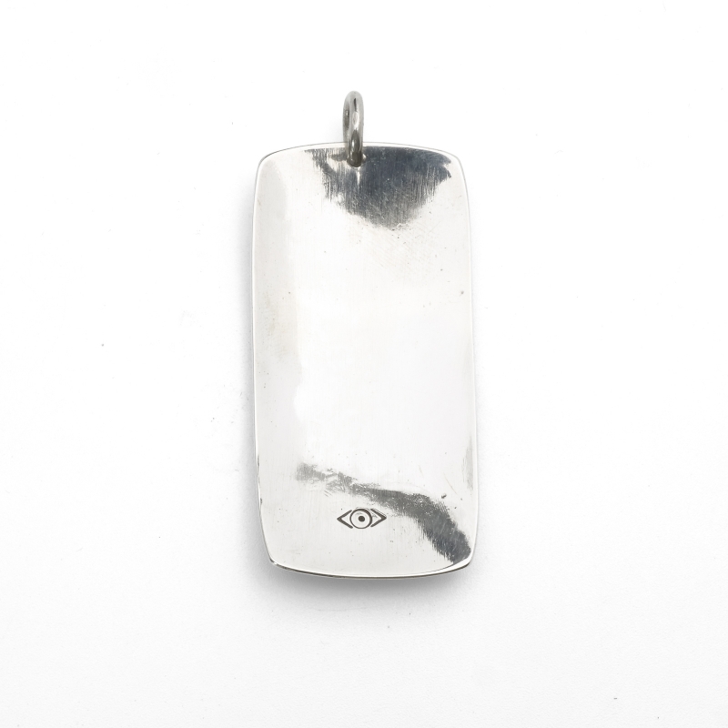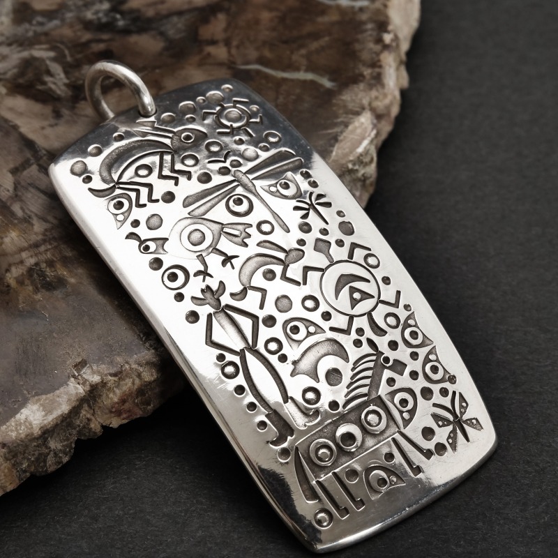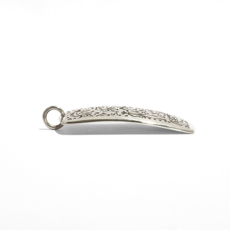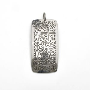 ナターシャペシュラカイのスタンプワークペンダントです。大きめの鏡面シルバーにぎっしりと打ち込まれているのは馬やカウボーイ、ウズラ、ウサギ、ベア、トンボにカメ。あらゆるペシュラカイスタイルのユニークな生き物がたくさん盛り込まれています。見ているだけで楽しくなるジュエリー。