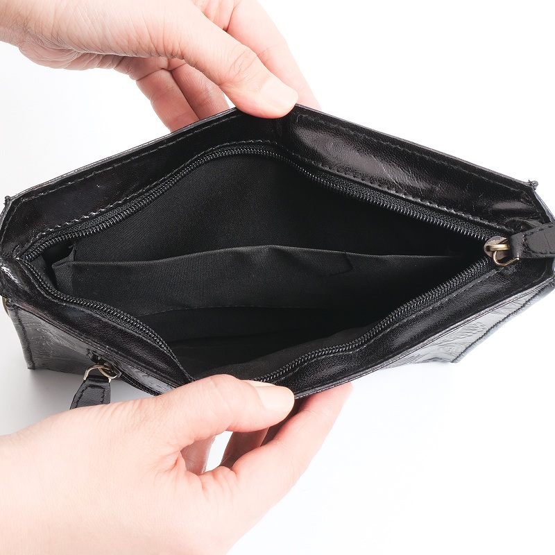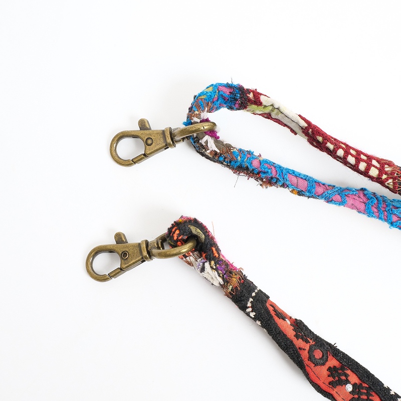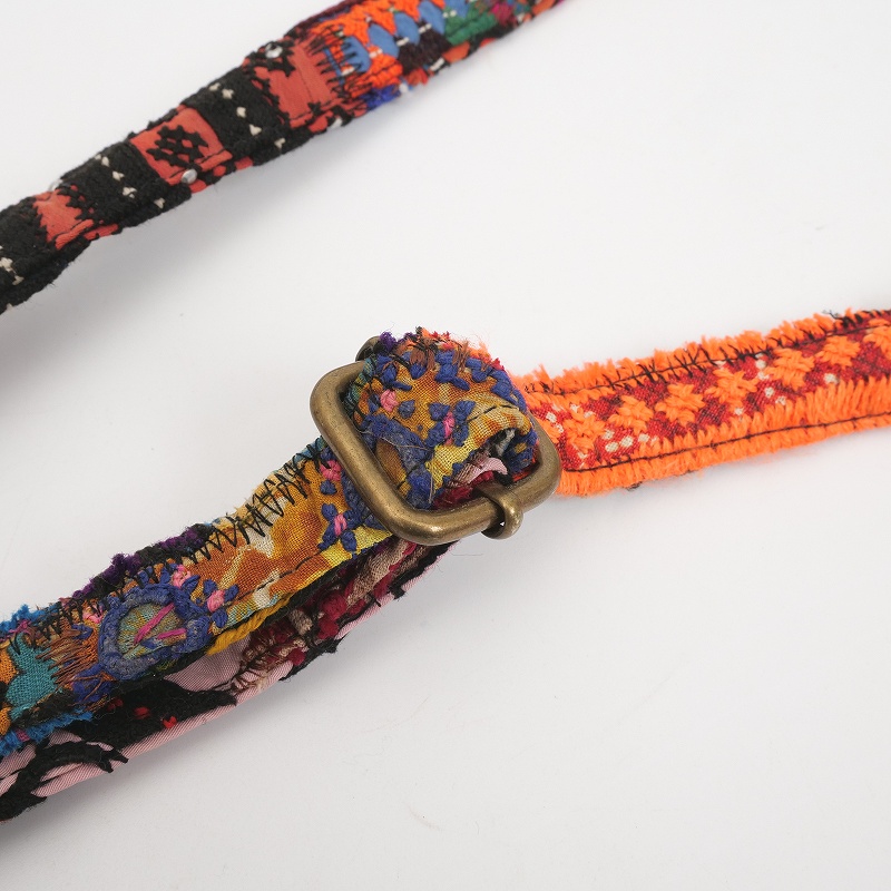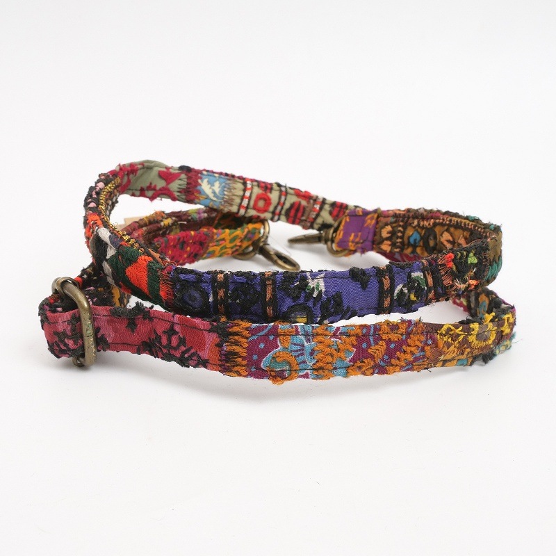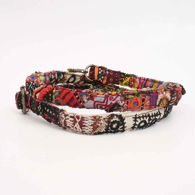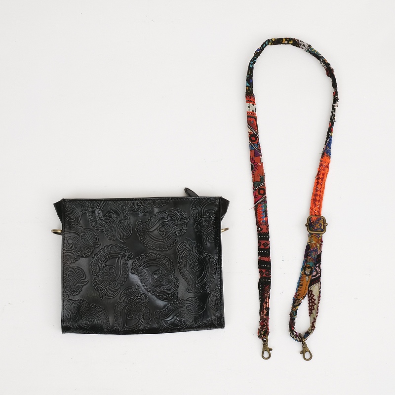 コルカタのエンボスレザーと古布ストラップを組み合わせたショルダーバッグ。バッグ本体には山羊革を使用し、細やかなペイズリー模様が型押しされた上品な表情が魅力です。ショルダーストラップには、パキスタンのオールドドレス古布をパッチワークした生地を使用。長さ調節が可能で、取り外しもできる仕様です。ショルダー部分はひとつひとつ色柄が異なる一点もの。山羊革は軽くて扱いやすく、フラットな形で小さめのお財布やスマートフォンをすっきり収納。アクセサリー感覚で取り入れられ、コーディネートのアクセントとして活躍してくれるアイテムです。