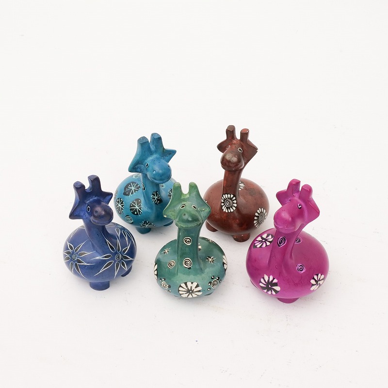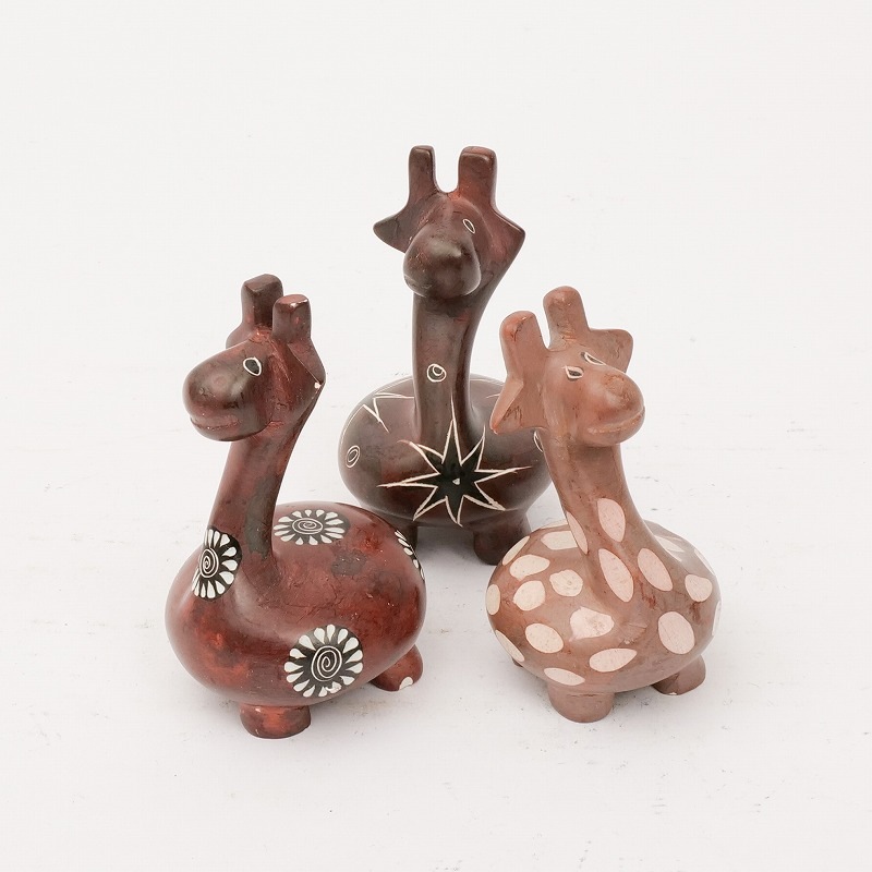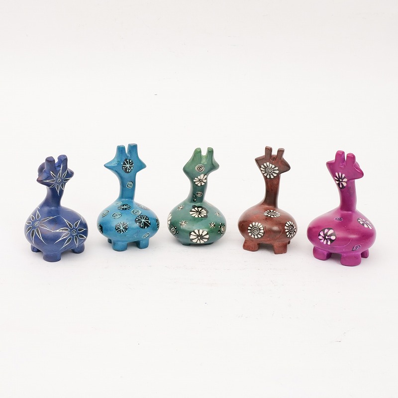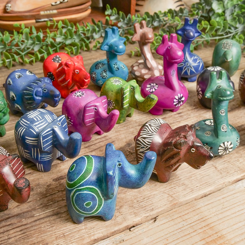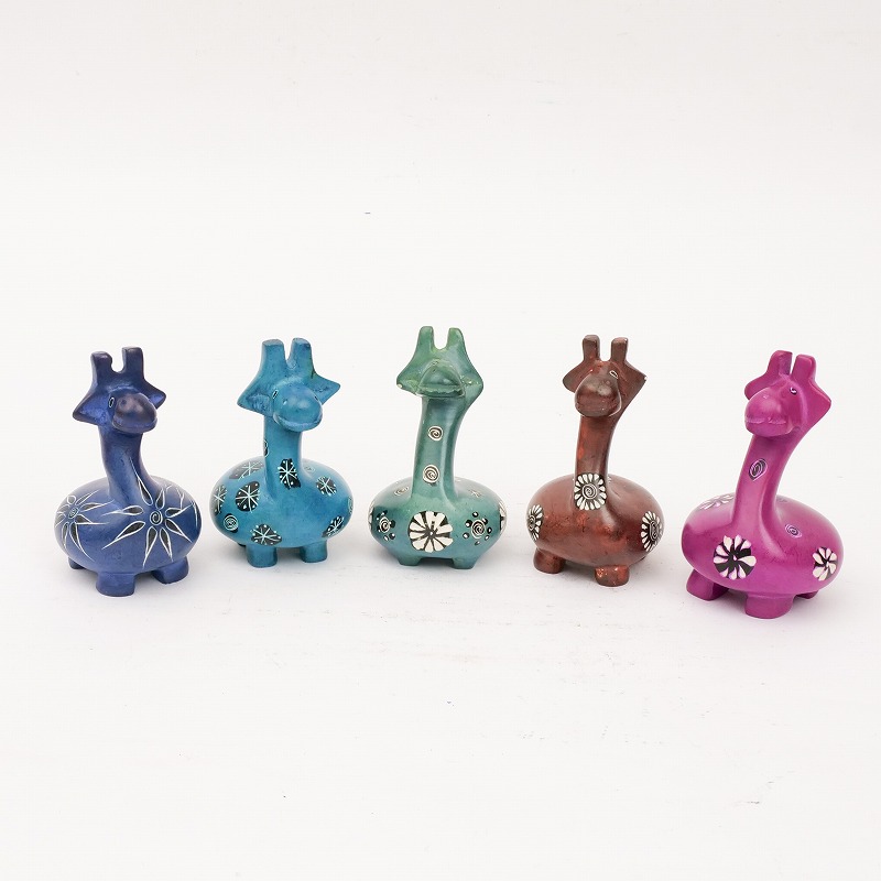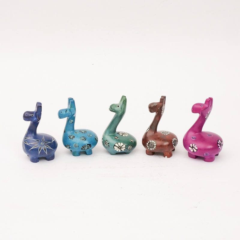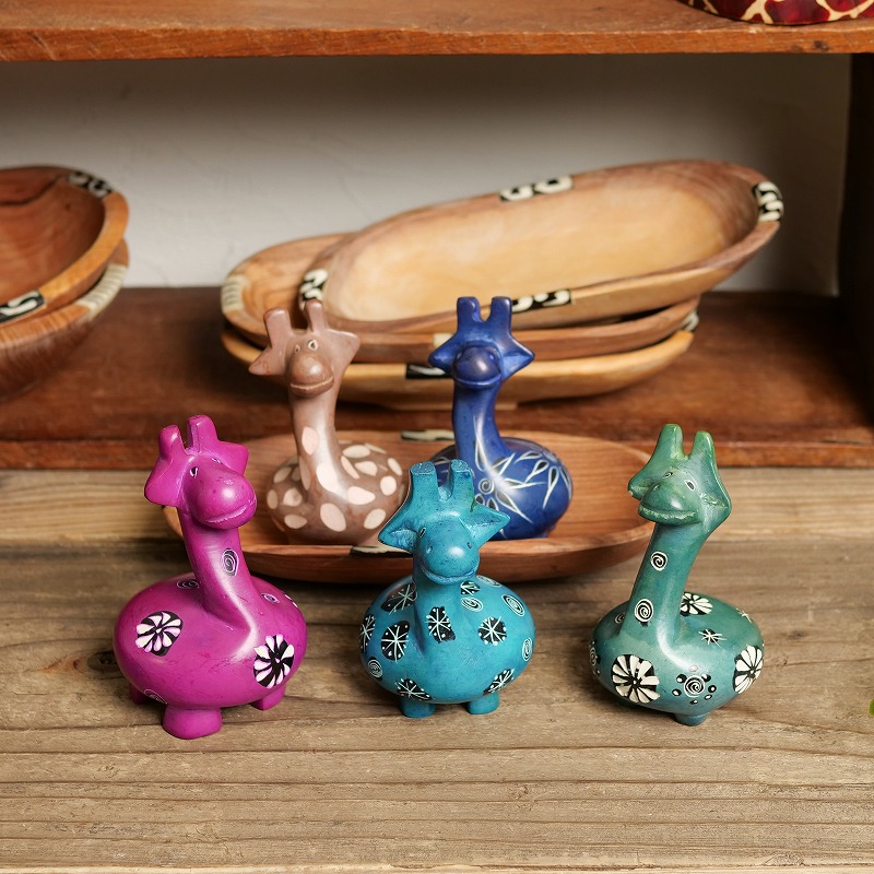 やわらかく加工しやすい天然石「ソープストーン」を使い、ひとつひとつ手彫り・手彩色で仕上げられたアニマルオブジェ。ケニア西部・グシイ地方で作られている、現地を代表する手工芸品です。すらりと伸びた首と、やさしい表情が印象的なキリン。シンプルながらも目を引くフォルムが魅力です。デスクや棚にちょこんと置くだけで、空間にさりげない動きをプラス。見るたびにほっとするような存在です。カラーはお選びいただけますが、細かな柄や表情は届いてからのお楽しみです。