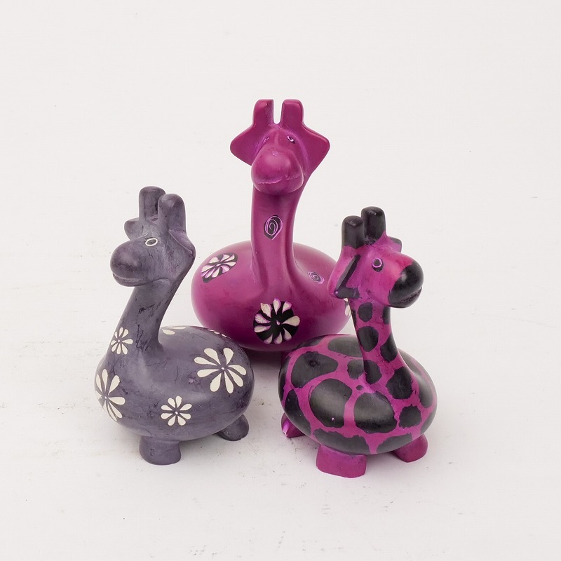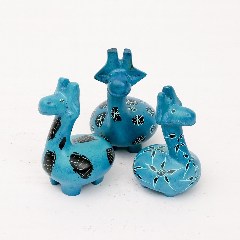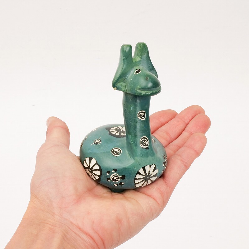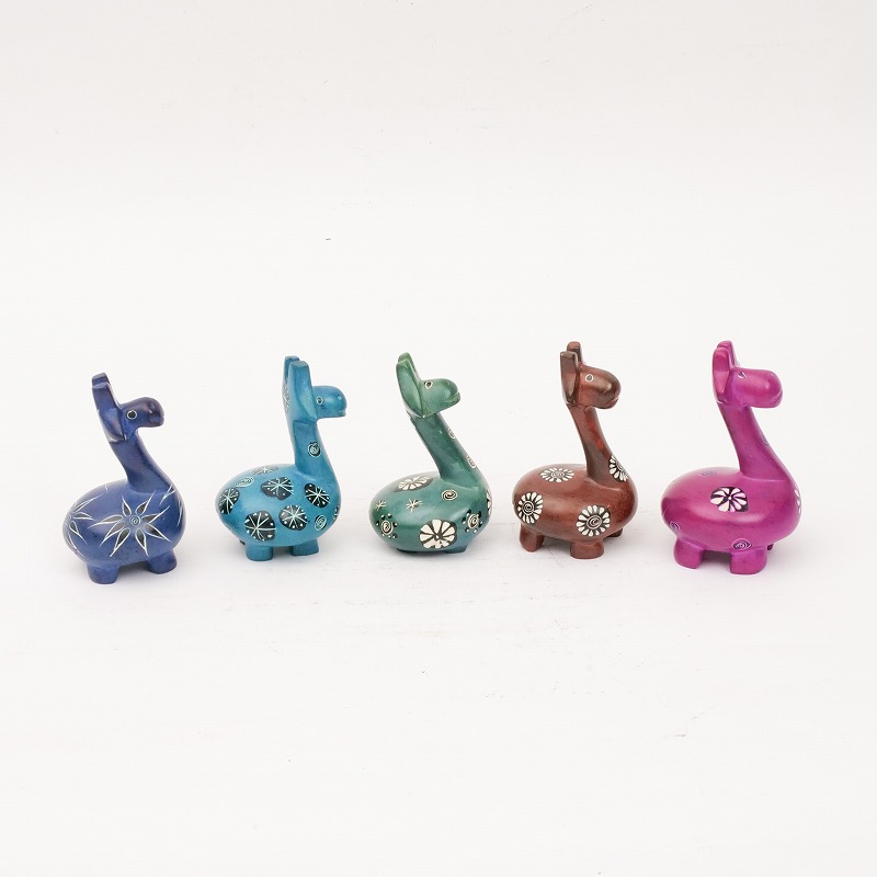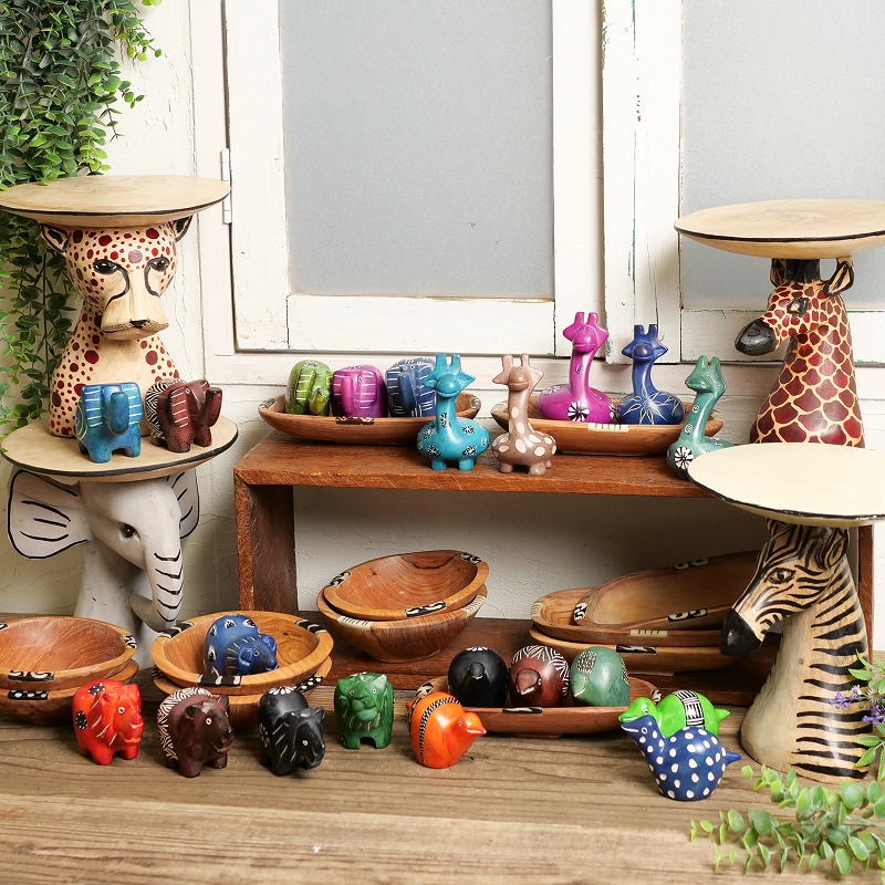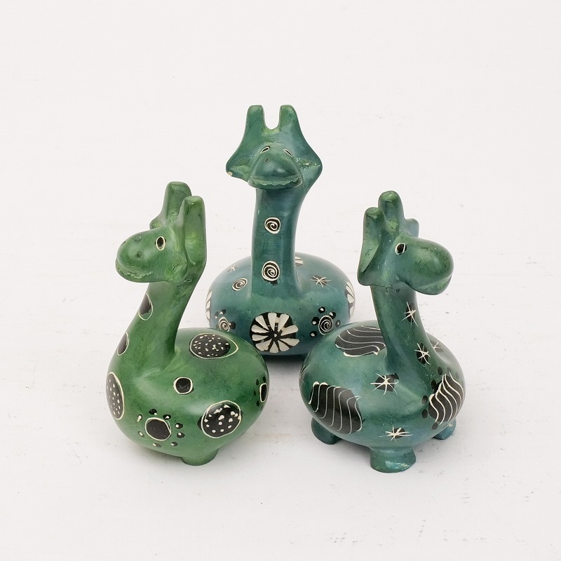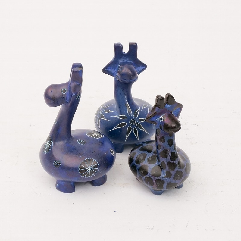 やわらかく加工しやすい天然石「ソープストーン」を使い、ひとつひとつ手彫り・手彩色で仕上げられたアニマルオブジェ。ケニア西部・グシイ地方で作られている、現地を代表する手工芸品です。すらりと伸びた首と、やさしい表情が印象的なキリン。シンプルながらも目を引くフォルムが魅力です。デスクや棚にちょこんと置くだけで、空間にさりげない動きをプラス。見るたびにほっとするような存在です。カラーはお選びいただけますが、細かな柄や表情は届いてからのお楽しみです。